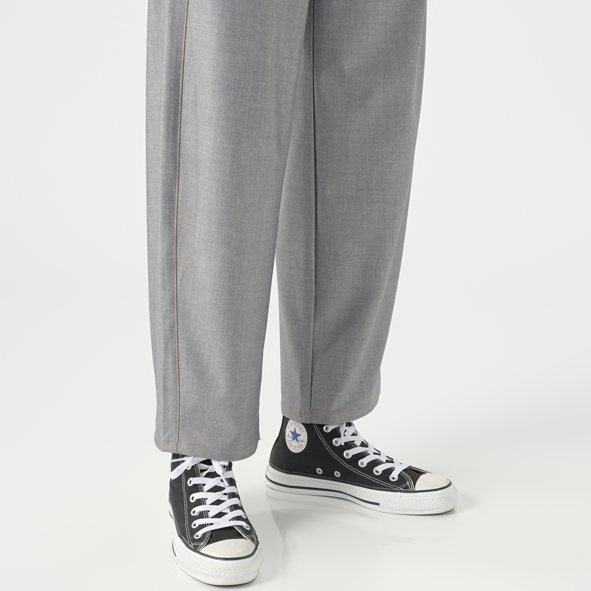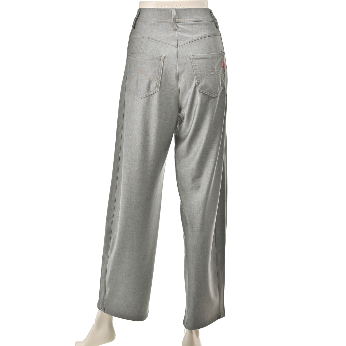 タテ編みタイプのハイテンションニット素材を使用。全方向に伸び、快適さときれいなシルエットを両立するカービーパンツです。原料を先に染めてベースカラーの上に転写プリントをすることで、リアルなデニム見えを追求。外側にカーブを入れたシルエットが足さばきを助け、きれいめで新鮮さのあるデザインです