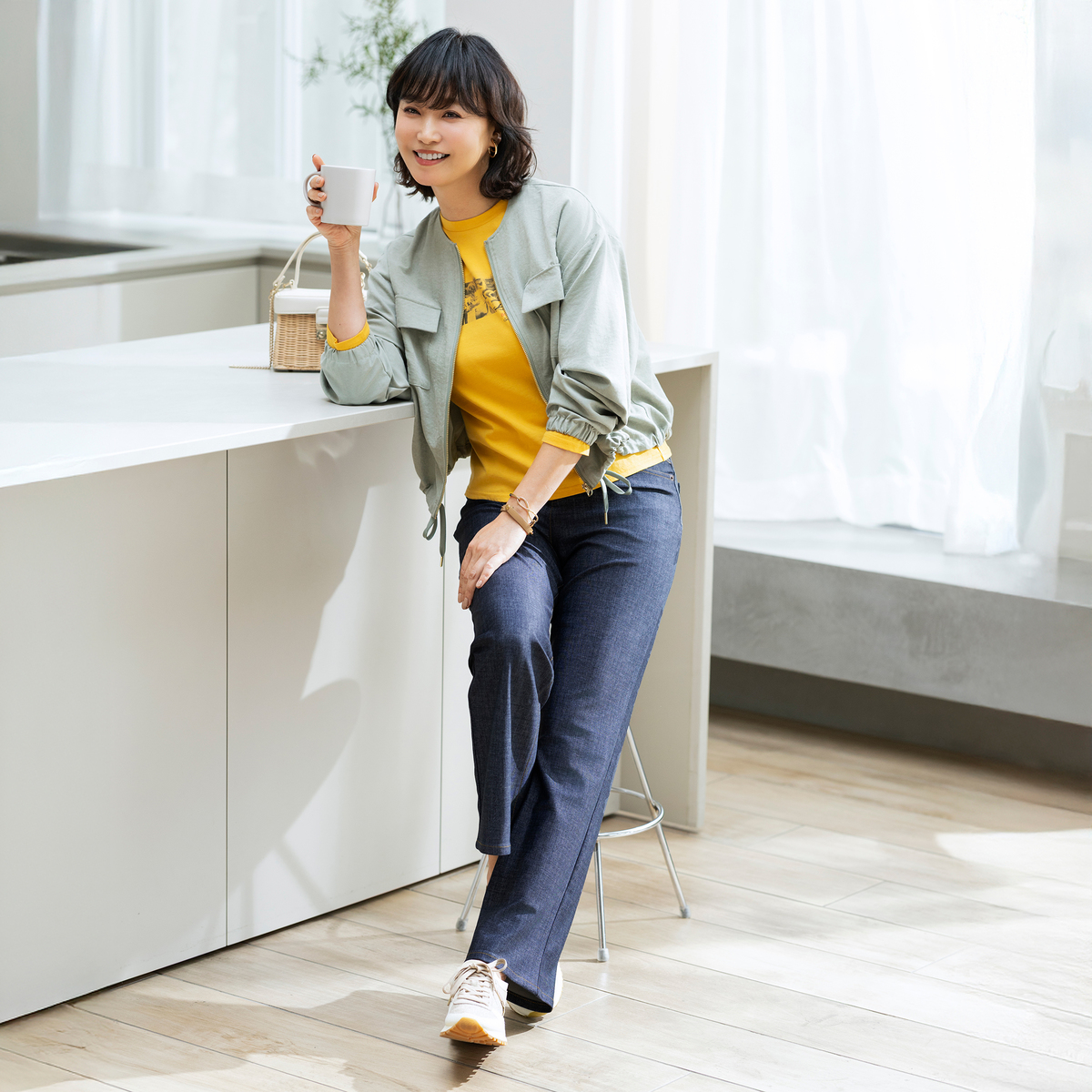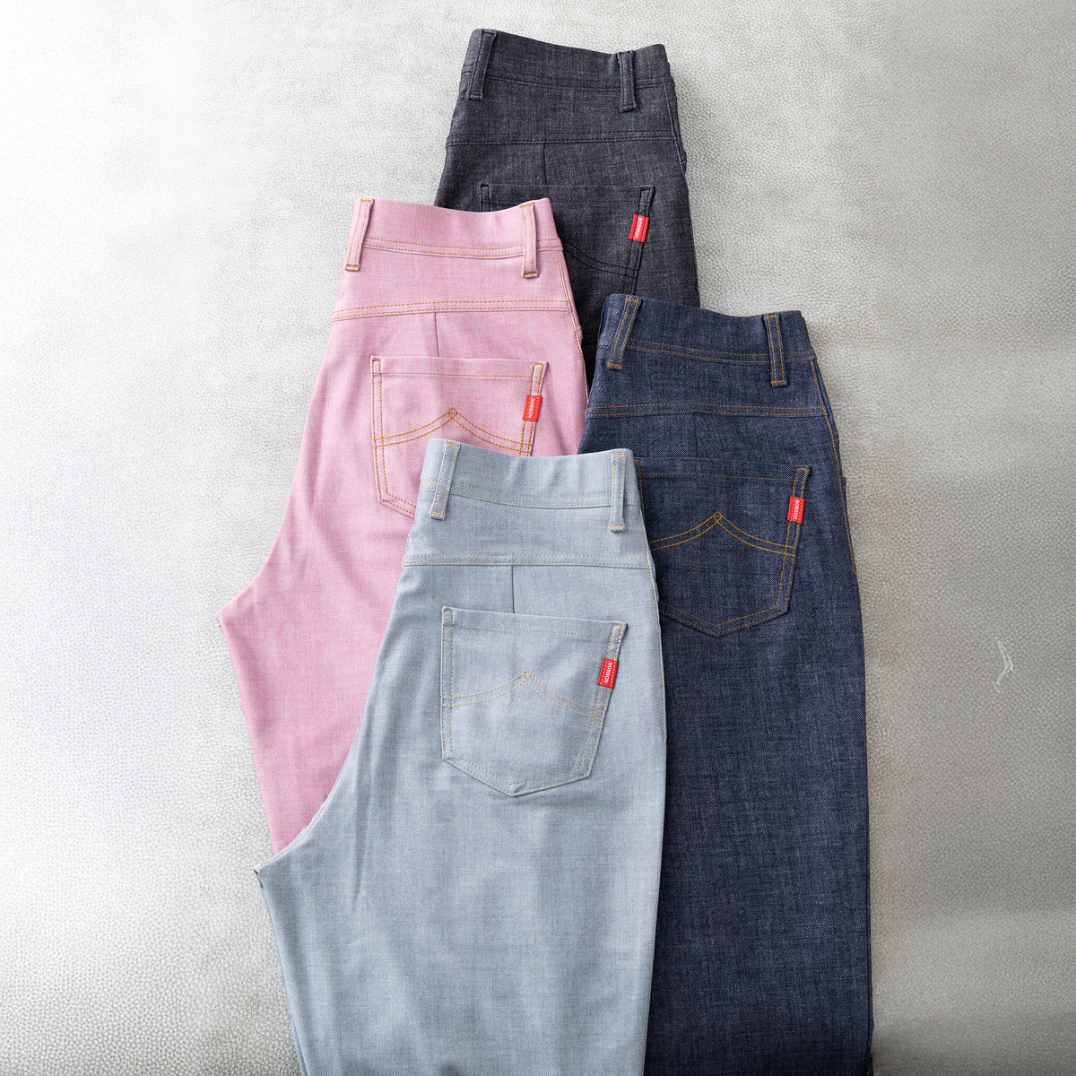 脚長効果が期待できる程よいハイウエスト感と、ヒップラインをきれいに見せる立体パターンを採用しました。オリジナルの山の形をしたステッチやメンズライクな大きめのバックポケットがアクセントになります