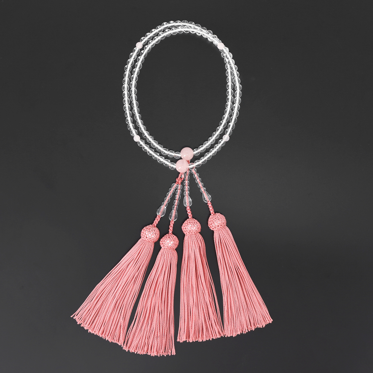 透明感のある水晶に穏やかなピンク色の紅水晶を組合せた本連念珠。落ち着いた色味の房が、全体を上品にまとめています