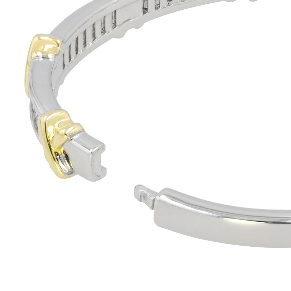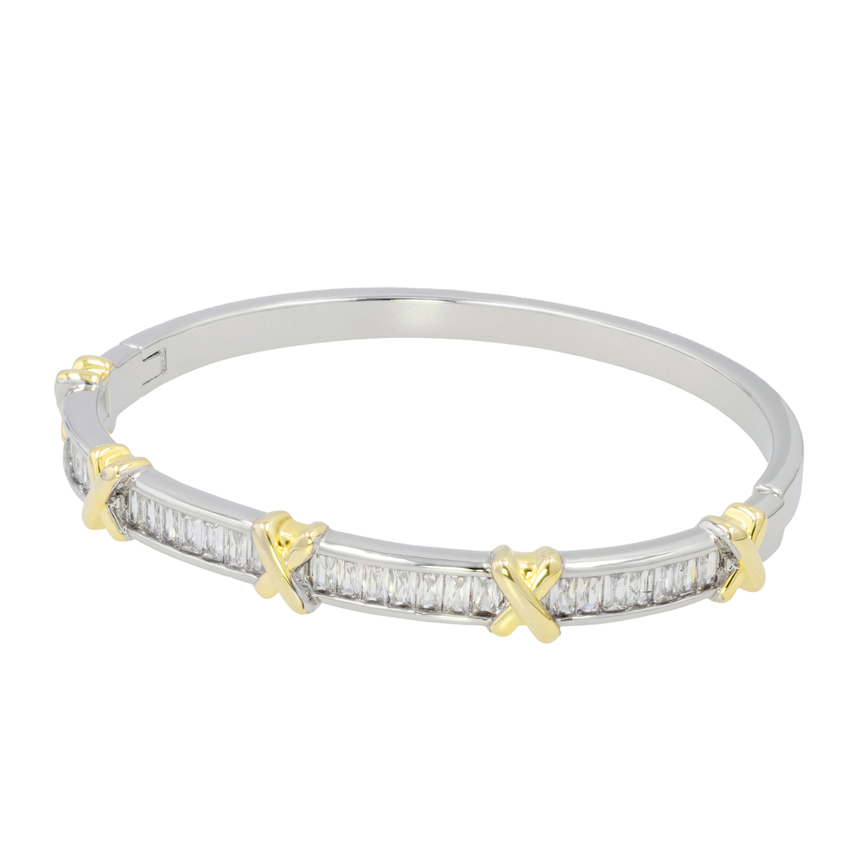 繊細なバゲットカットのキュービックジルコニアがシルバートーンの地金に美しく並び、ゴールドトーンの「X」モチーフがアクセントに。クラシックでありながらモダンな印象を演出します