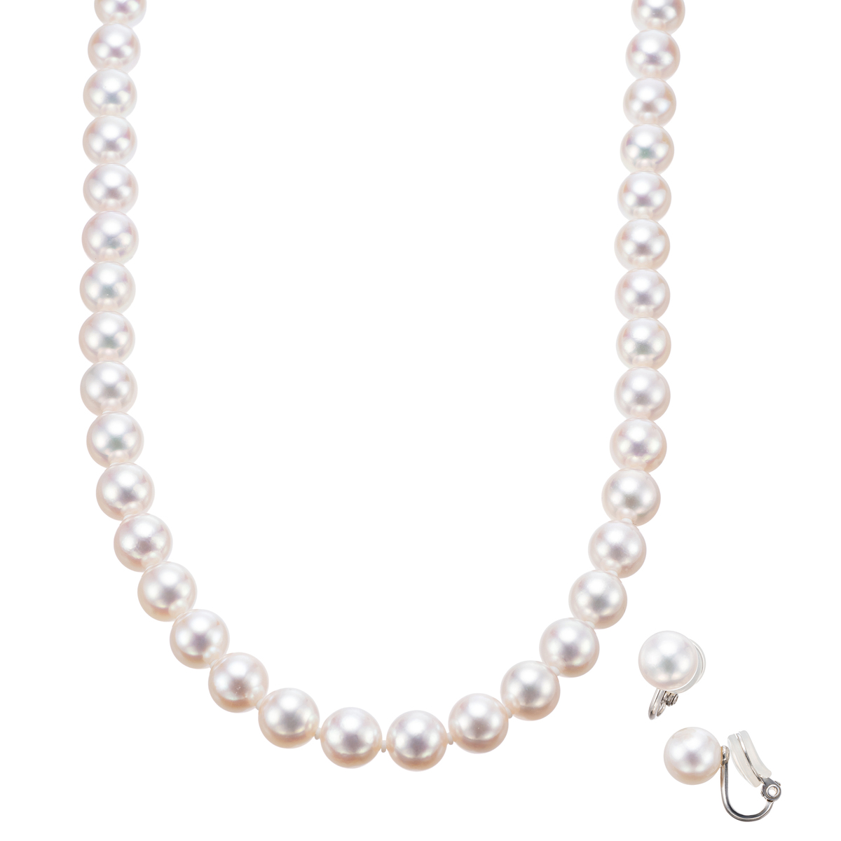 素材: <ネックレス> [アコヤ真珠(花珠)] 8.5mmUP ラウンド 貫通 <イヤリング/ピアス> [アコヤ真珠(花珠)] 8.5mmUP ラウンド 芯立て/接着 2珠 [地金] ネックレス:シルバー イヤリング・ピアス:シルバー925 [メッキ] シルバーカラーメッキ <ネックレス> 総重量(約) 42cm:40.0g 45cm:41.3g 長さ(約) 42cm:42.0cm 45cm:45.0cm 幅(約) 8.5mm 留具の形状 差し込み式 アジャスターの有無 無 <イヤリング> 縦×横(約) 8.5×8.5mm(金具含まず) 総重量(約) 2.5g 留具の形状 クリップ(シリコン付) <ピアス> 縦×横(約) 8.5×8.5mm(金具含まず) 総重量(約) 1.7g 留具の形状 ポスト&キャッチ(シリコン付) [付属品] 鑑別書 ■受注発注商品のためデザイン・価値に影響のない範囲で仕様が変わる場合がございます ■素材の大きさ・形・色合い、製品のサイズは1点1点多少異なります 【日本製】