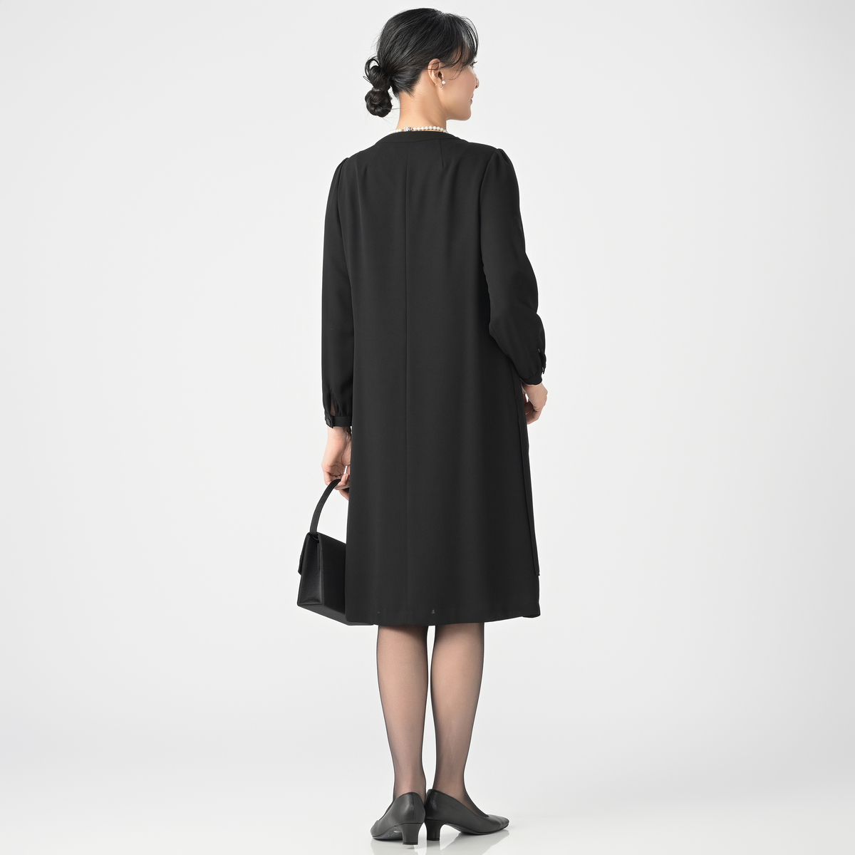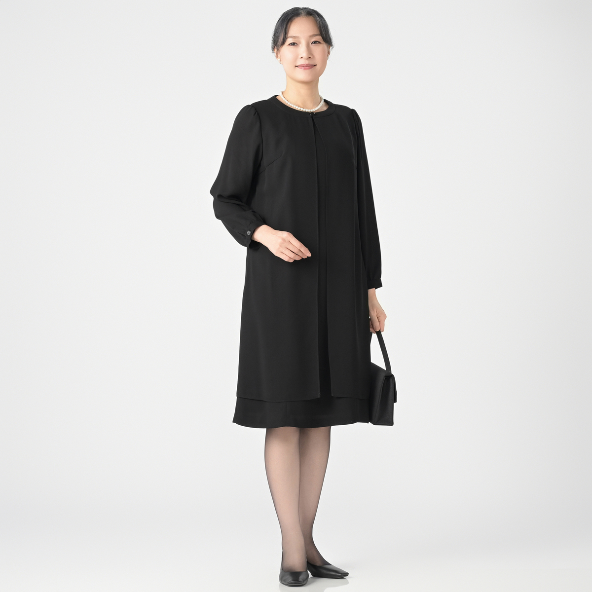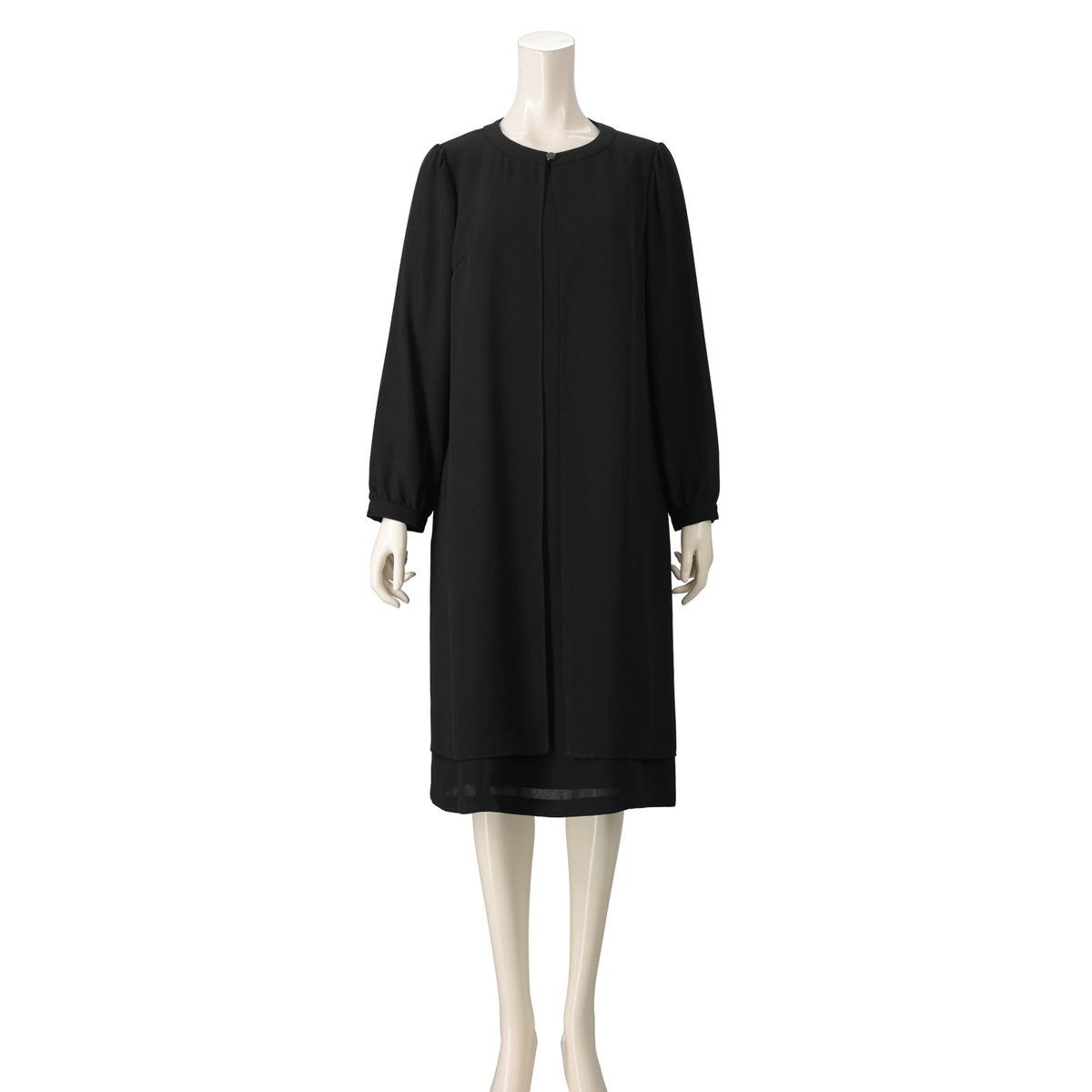 ノーカラーのロングジャケットを重ねたような、重ね着風のワンピース。上質なブラック生地を使用し、絞りのないオフシルエットで長時間でも快適です。ご家庭で洗濯機洗いでき(ネット使用)、汗ばむ季節も扱いやすく、アクセサリーや小物との組合せで、喪の場面からオフィスシーンまで幅広く活躍します