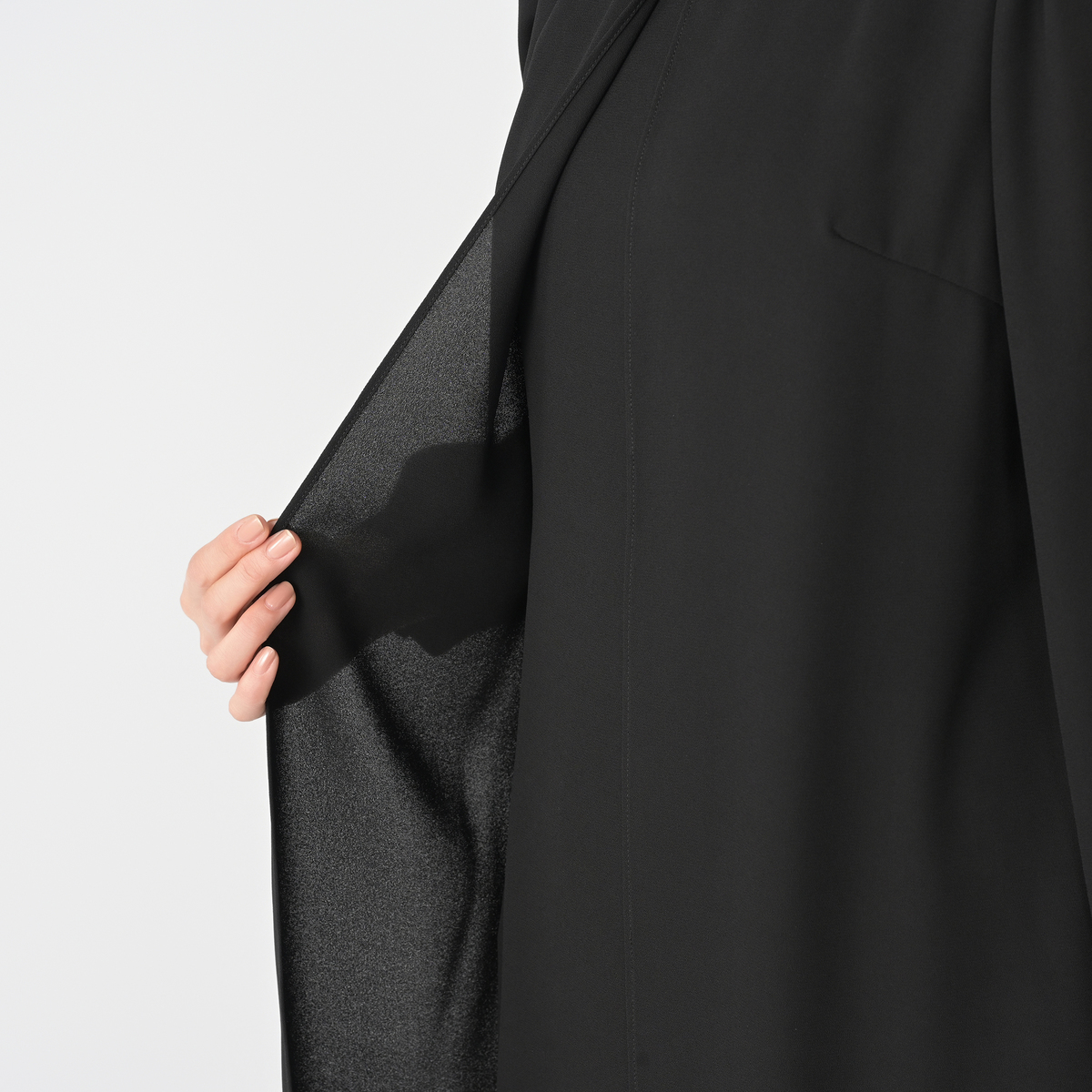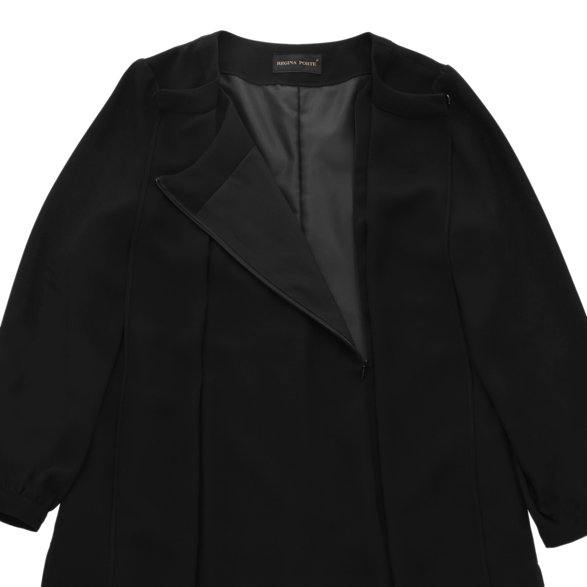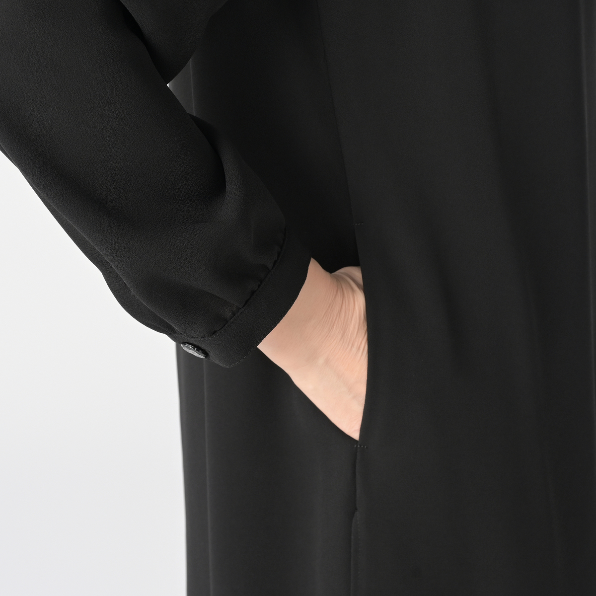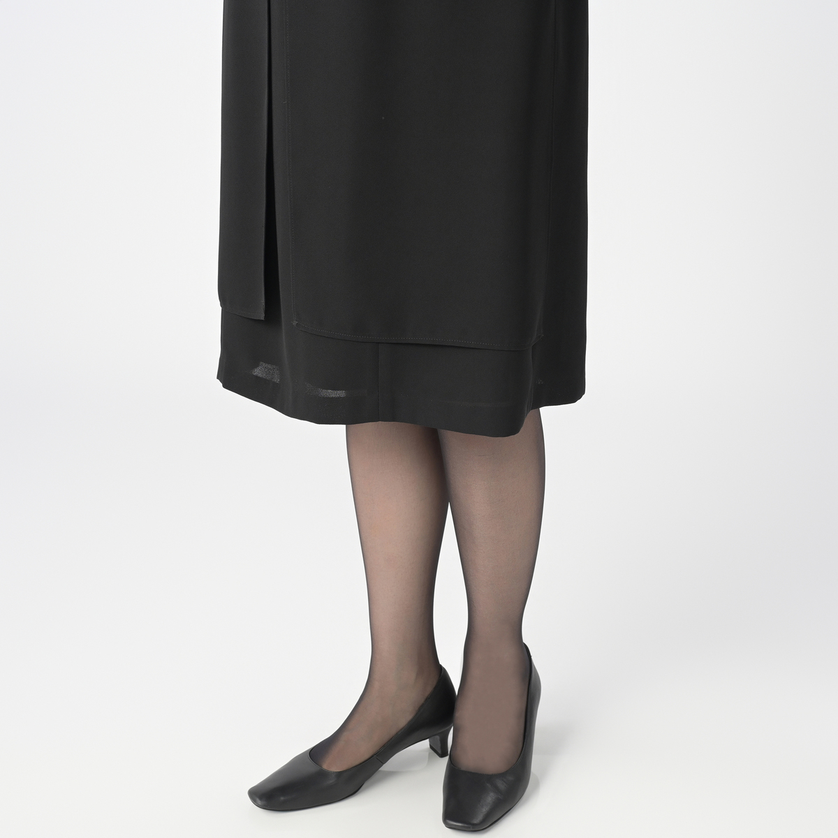 ノーカラーのロングジャケットを重ねたような、重ね着風のワンピース。上質なブラック生地を使用し、絞りのないオフシルエットで長時間でも快適です。ご家庭で洗濯機洗いでき(ネット使用)、汗ばむ季節も扱いやすく、アクセサリーや小物との組合せで、喪の場面からオフィスシーンまで幅広く活躍します