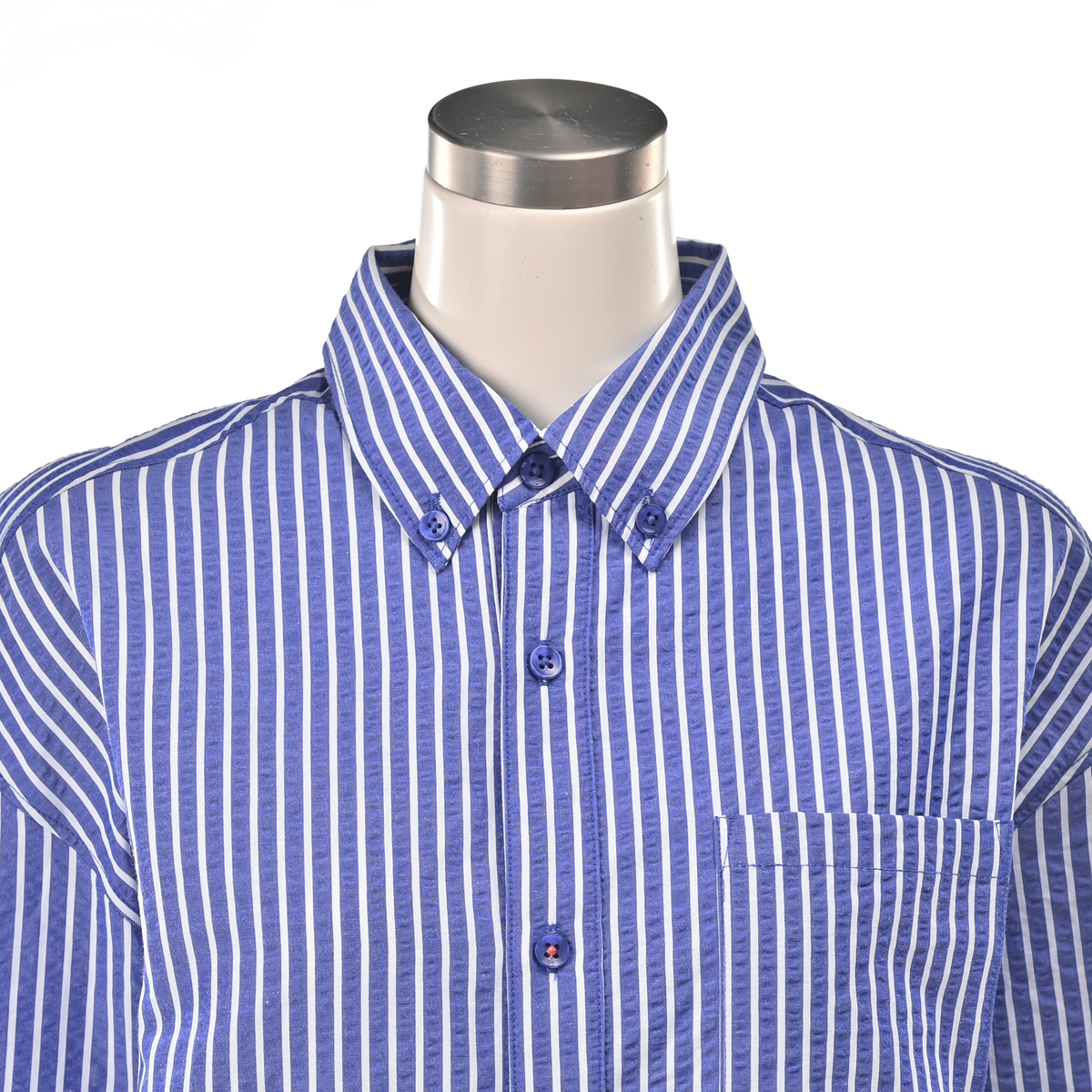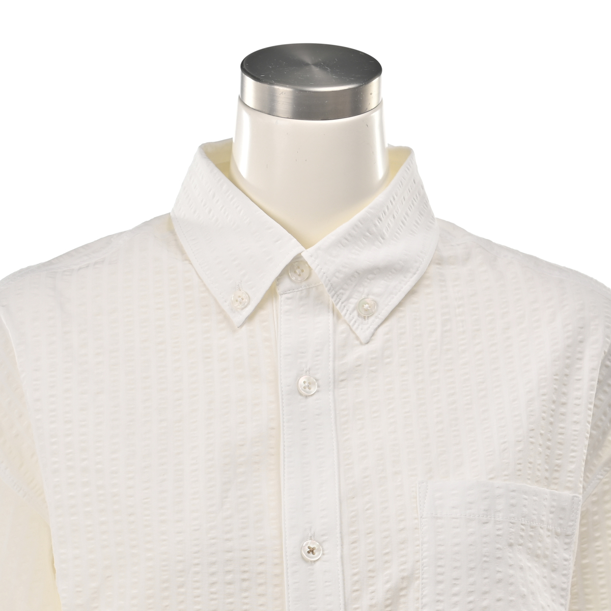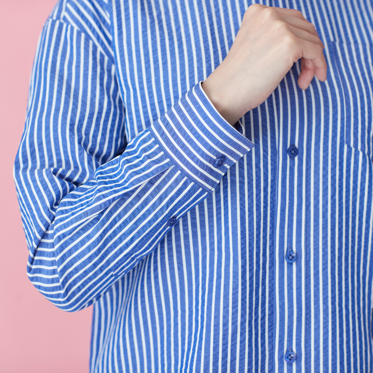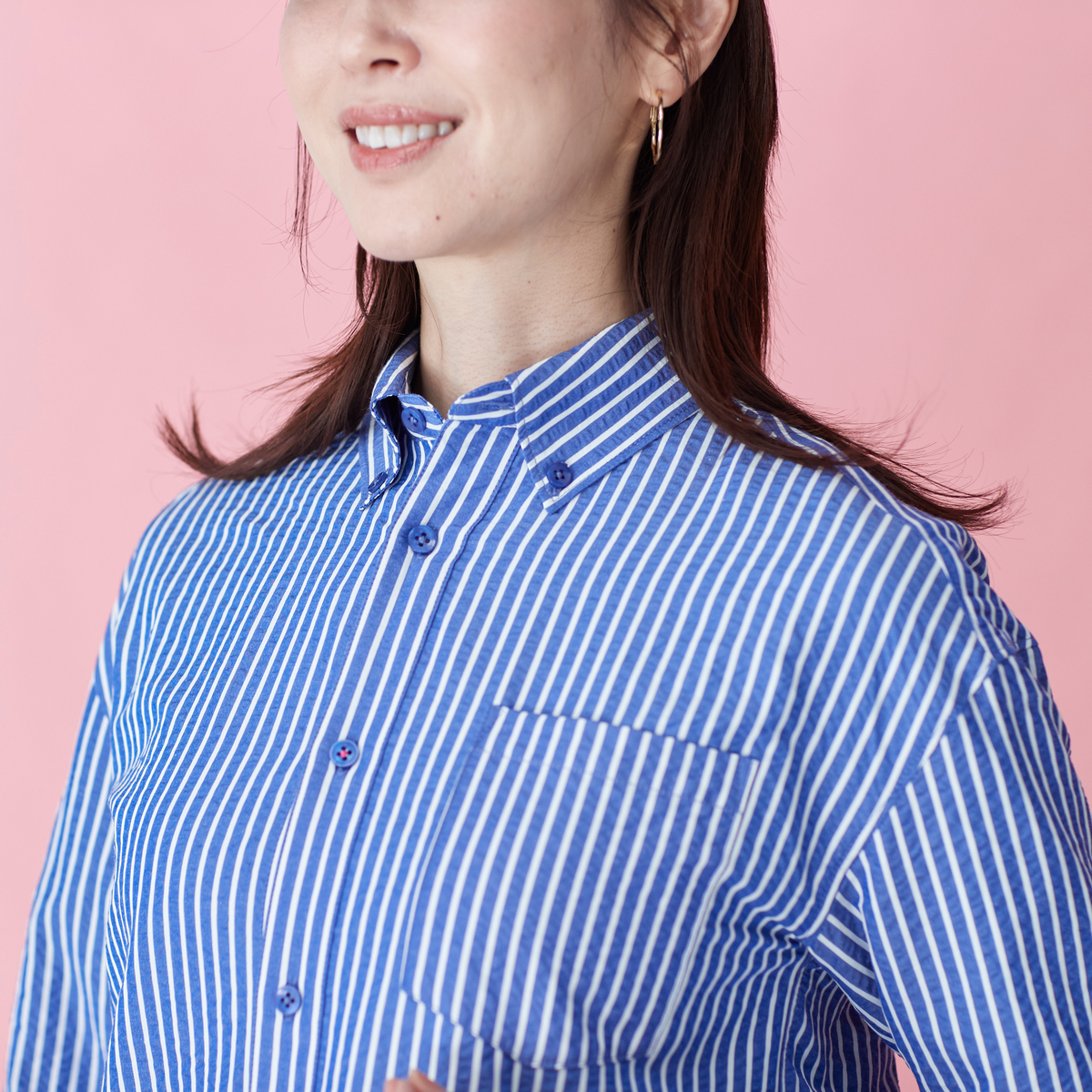 メンズライクに着こなせる左前でお仕立てしたサッカーストライプシャツ。大き目な胸ポケットとボタンダウンのえりがポイント。インナーにして襟だけチラ見せしたり、フロントを開けて軽い羽織としても。ベーシックなアイテムなので、幅広く活躍します