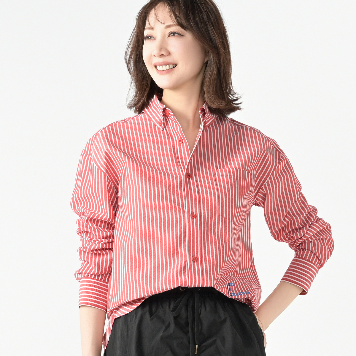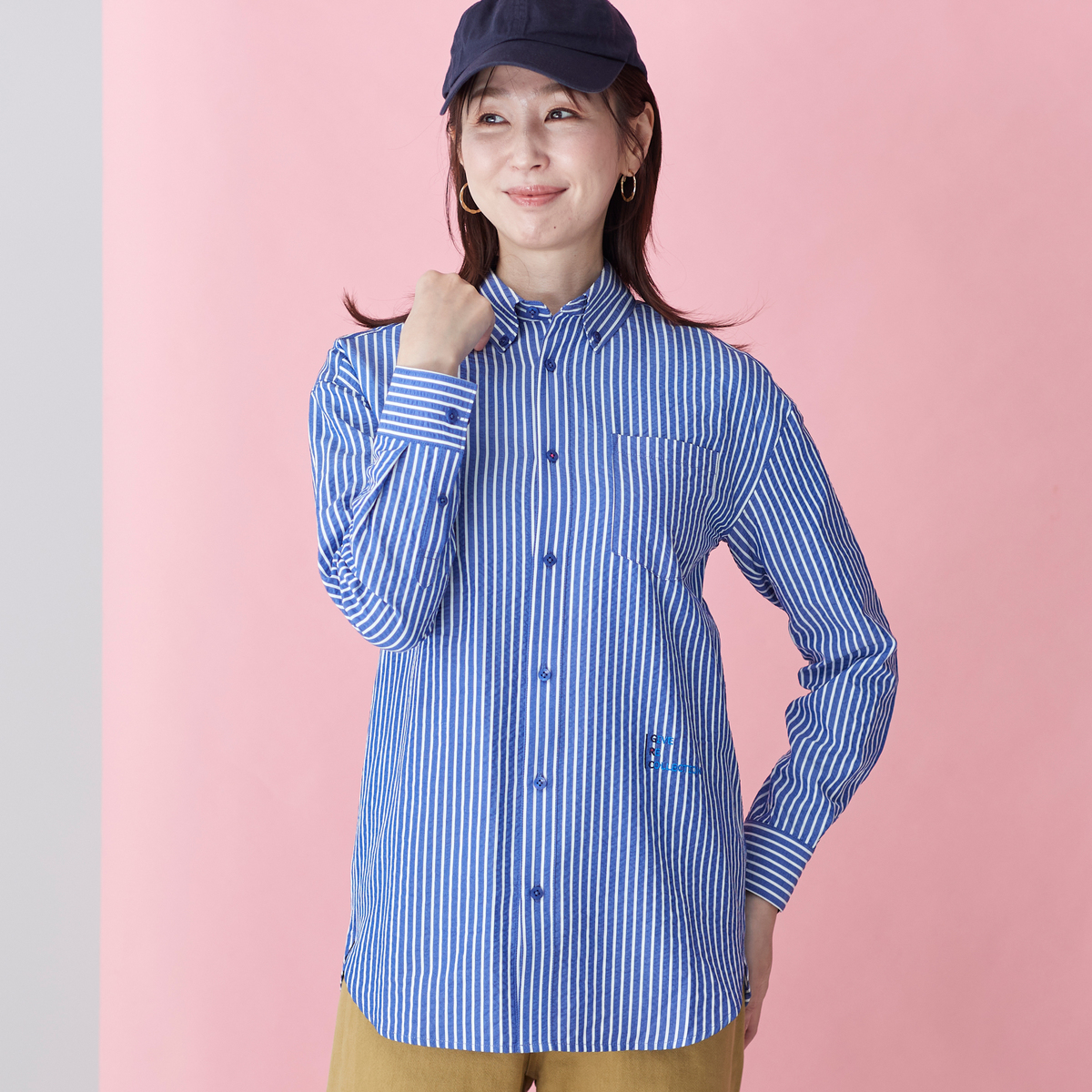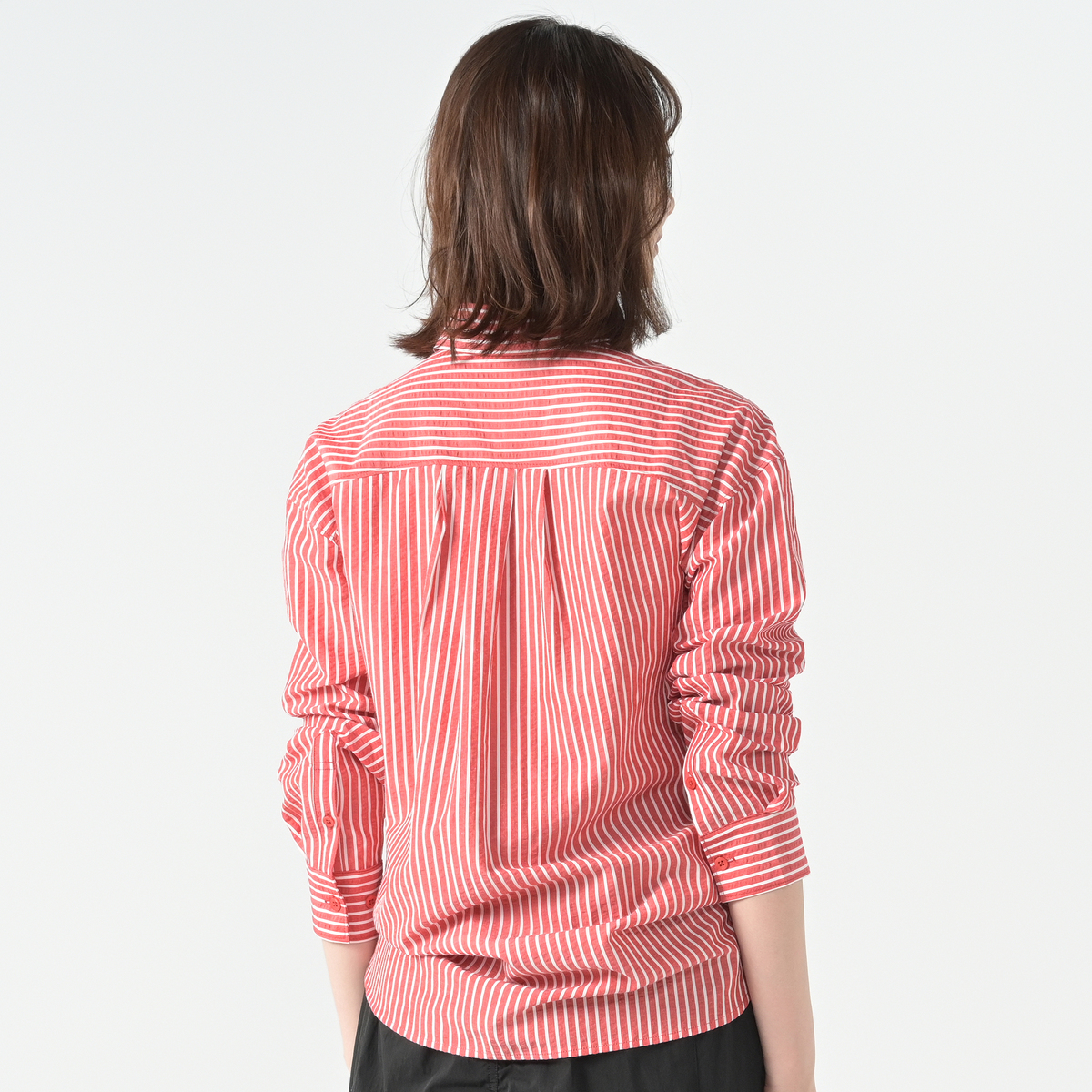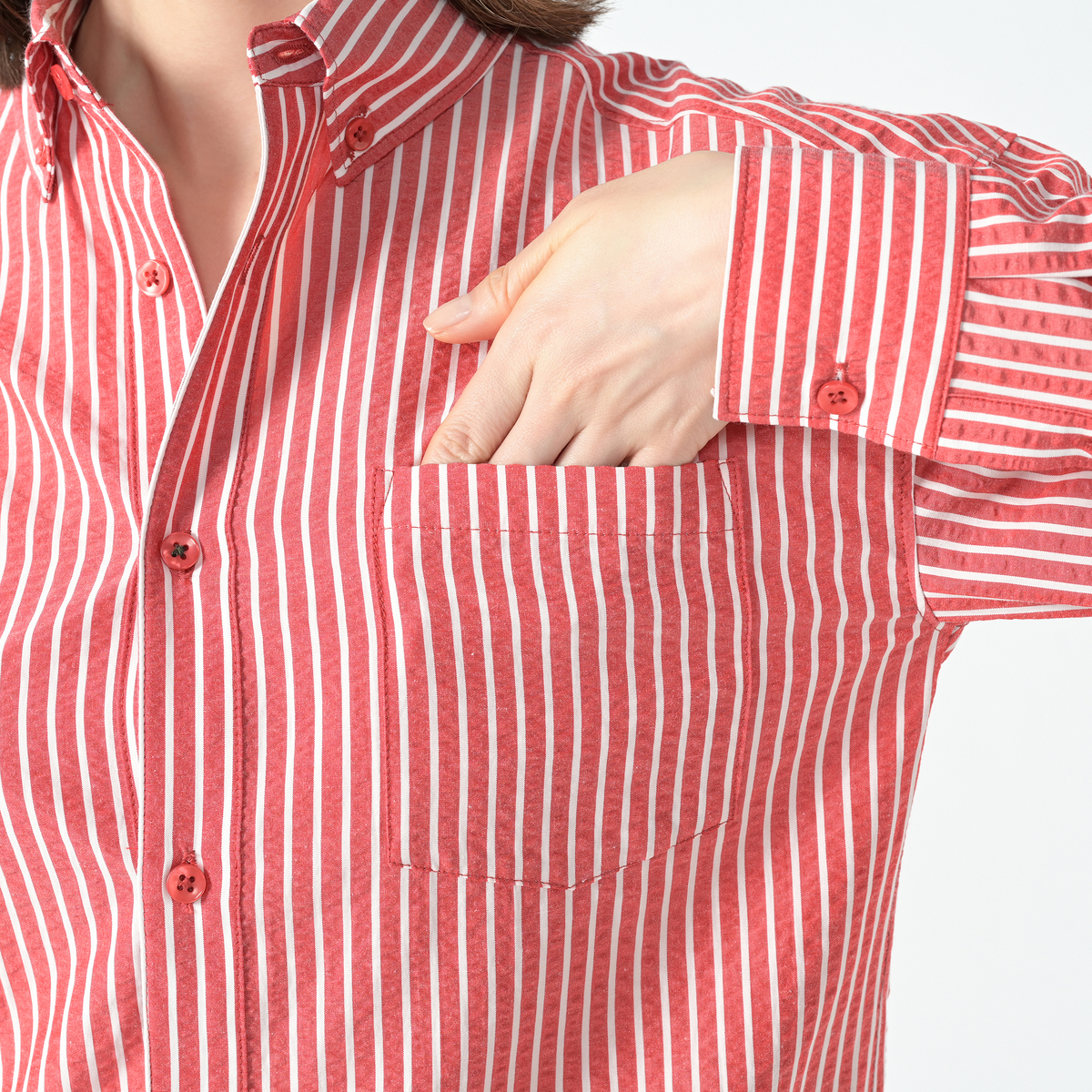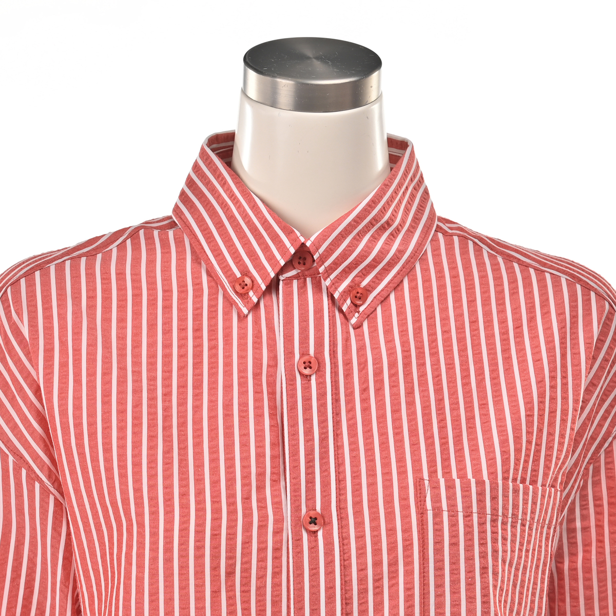 メンズライクに着こなせる左前でお仕立てしたサッカーストライプシャツ。大き目な胸ポケットとボタンダウンのえりがポイント。インナーにして襟だけチラ見せしたり、フロントを開けて軽い羽織としても。ベーシックなアイテムなので、幅広く活躍します