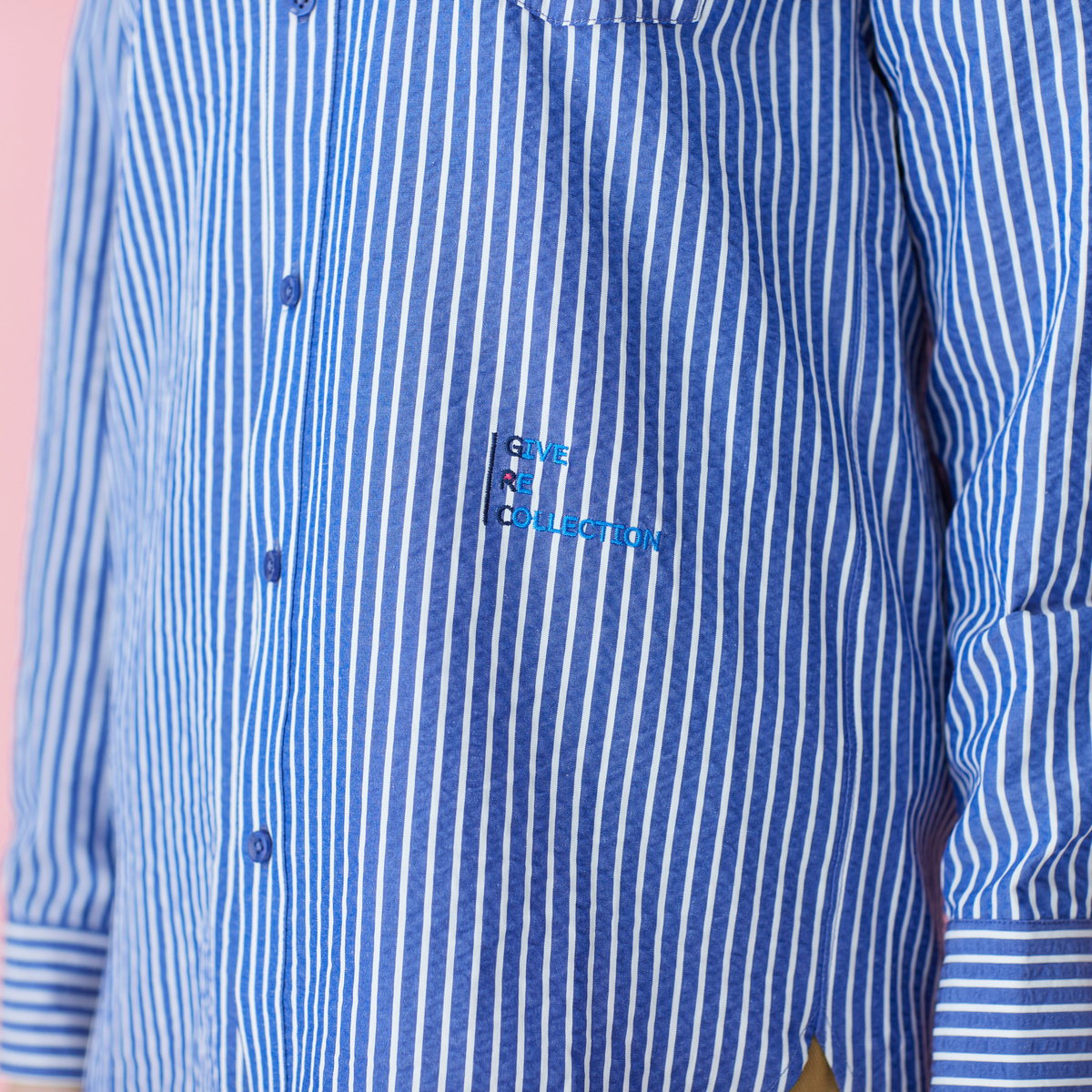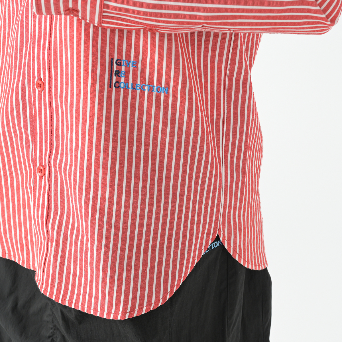 フロントボタンの付け糸1つが、ロゴ刺繍のポイントカラーと色合わせした配色カラーになっています