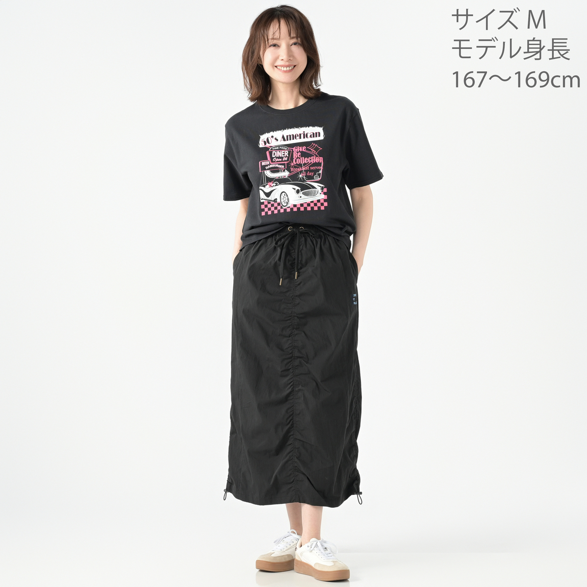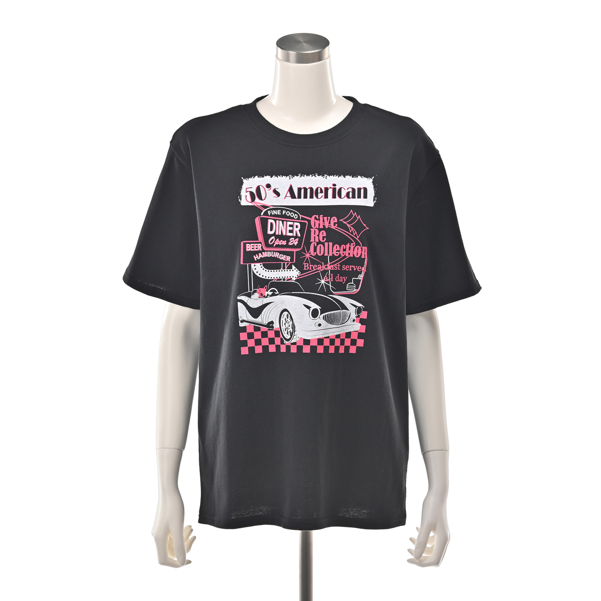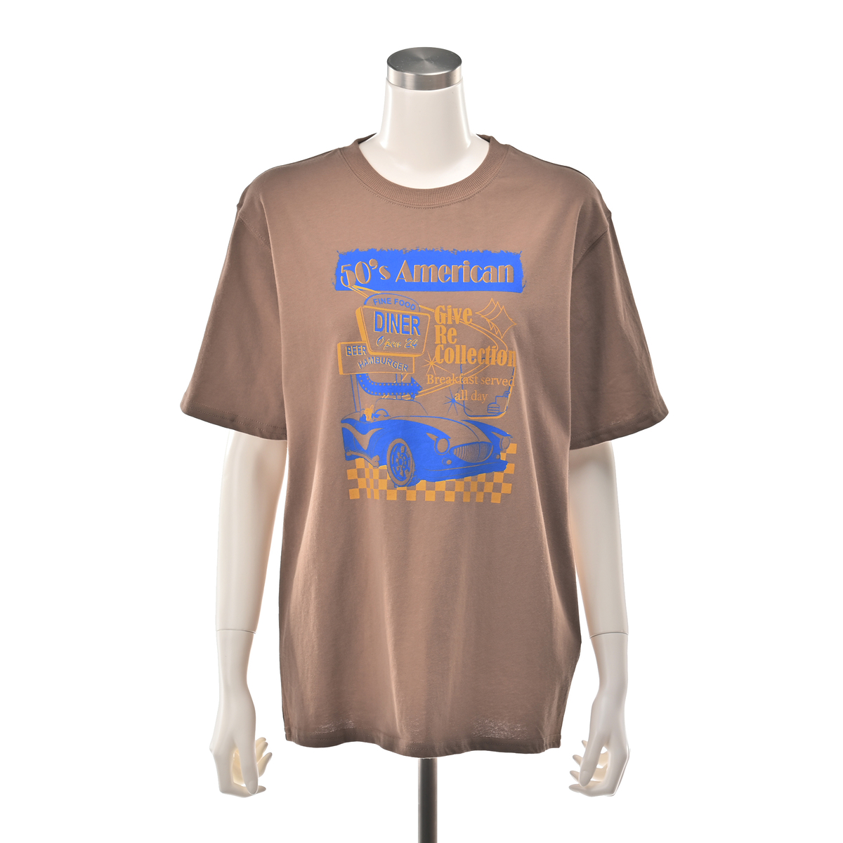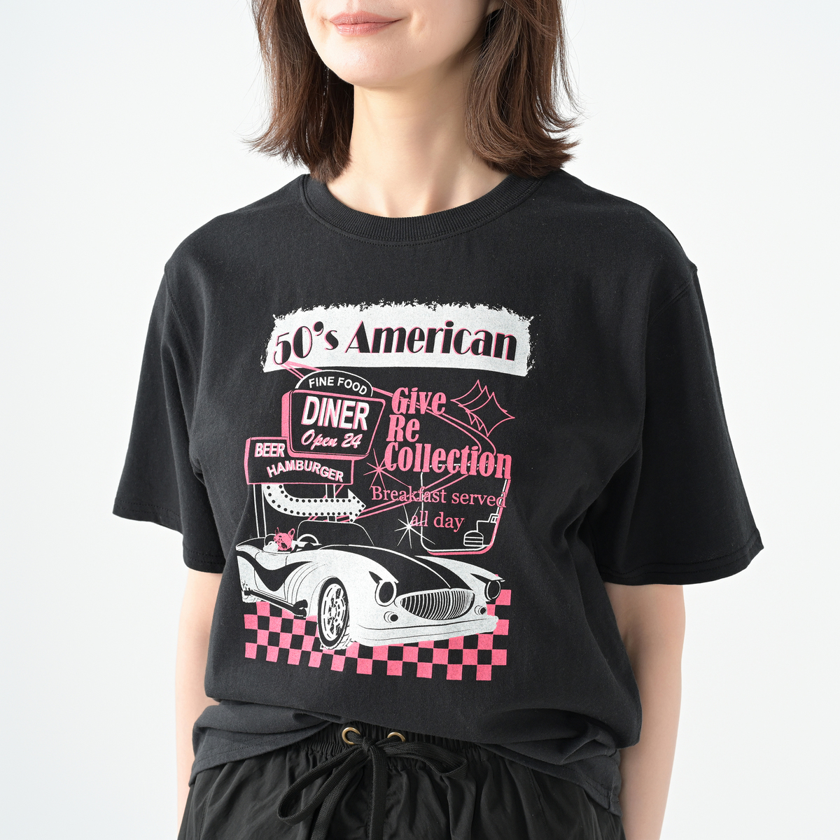 1950年代のアメリカンダイナーを思わせるレトロなプリントが目を引くTシャツです。ホット君をはじめユニークなモチーフがコーディネートに個性をプラスし、デイリーにも友人とのお出かけにも活躍します