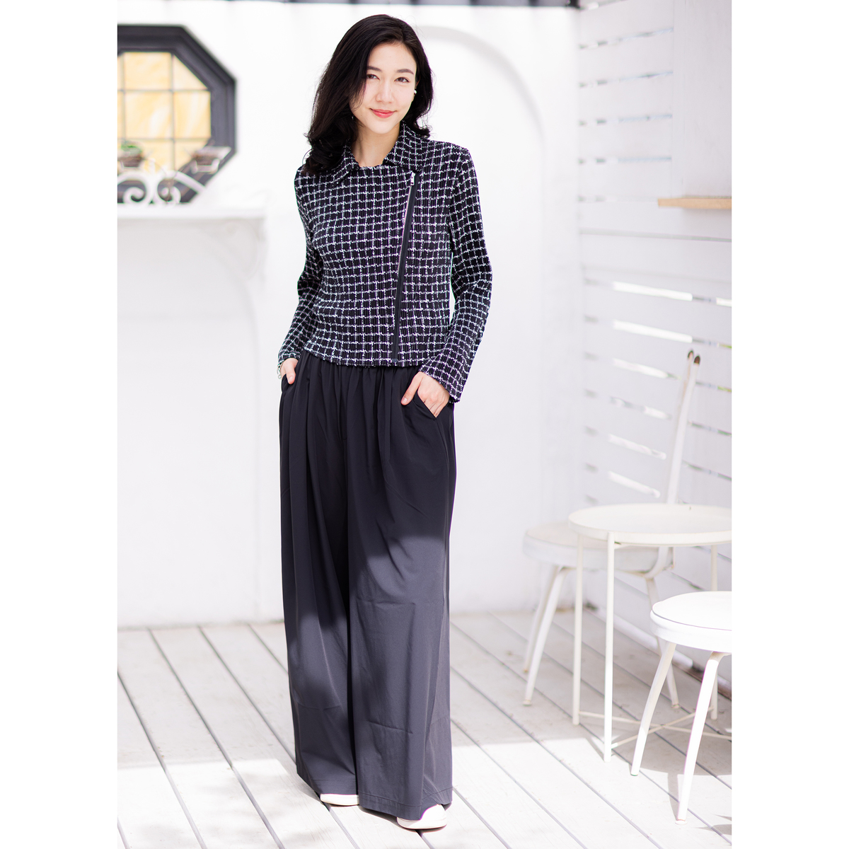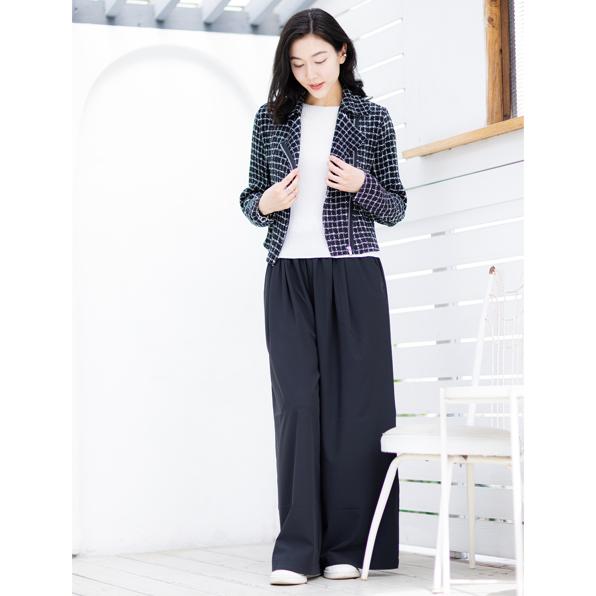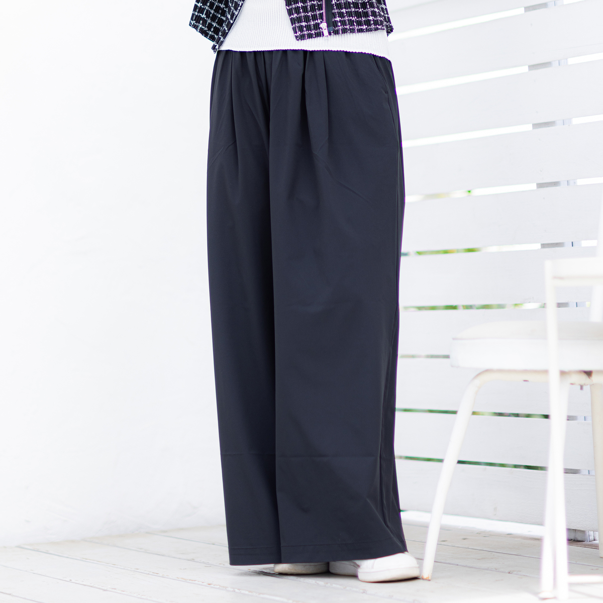ゆったり穿けるワイドパンツ。脚をまっすぐ見せるシルエットで、シンプルなトップスとの組合せでもすっきりとした印象にまとまります。2タックでお腹まわりをカバーし、インもアウトもバランスよく決まる設計。腰位置を高く見せる後ろの飾りポケットがスタイルを整え、幅広いコーデで活躍します