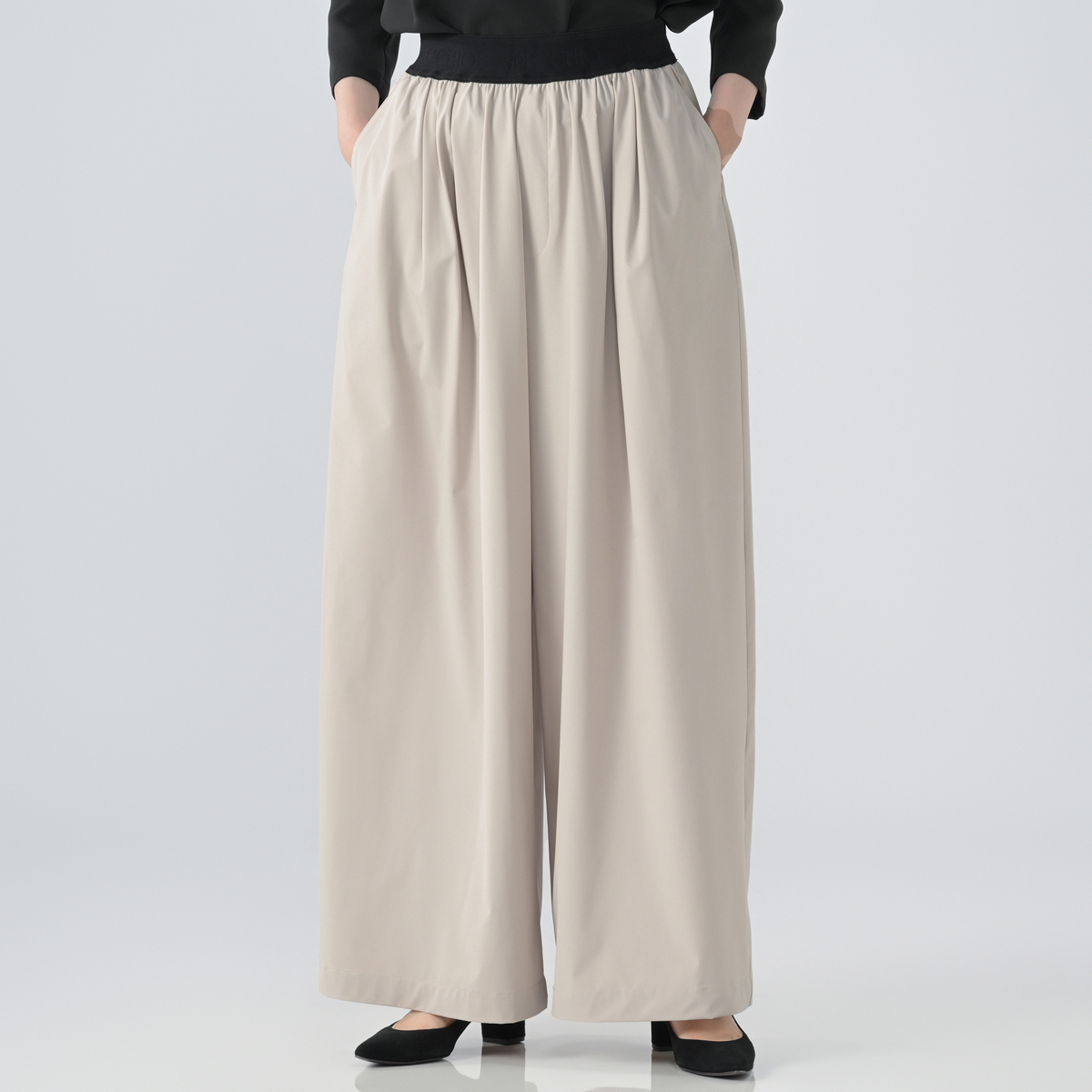 ロゴジャガードのソフトゴムウエストが締めつけを抑え、お腹まわりの負担を軽減。ややストレッチ性のある生地で、しゃがむ動作もスムーズで動きやすさも確保。ワイドパンツのサイズ選びやお腹の苦しさから解放してくれるアイテムです