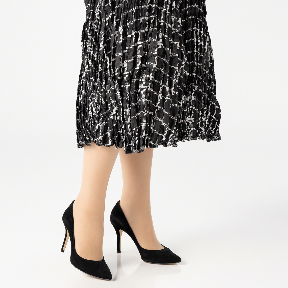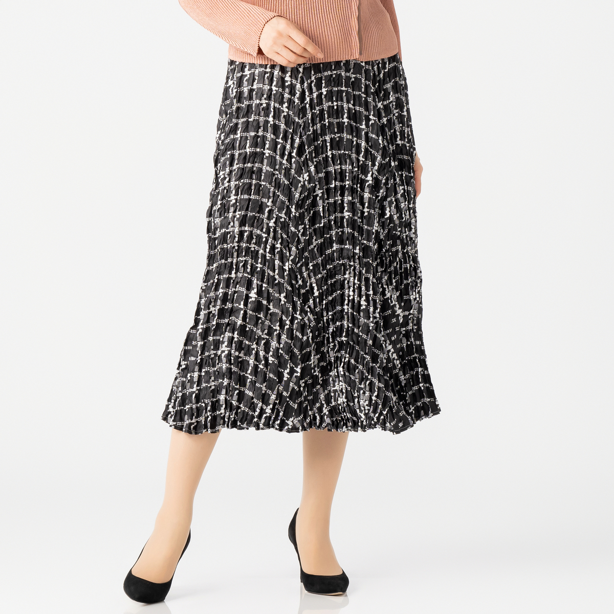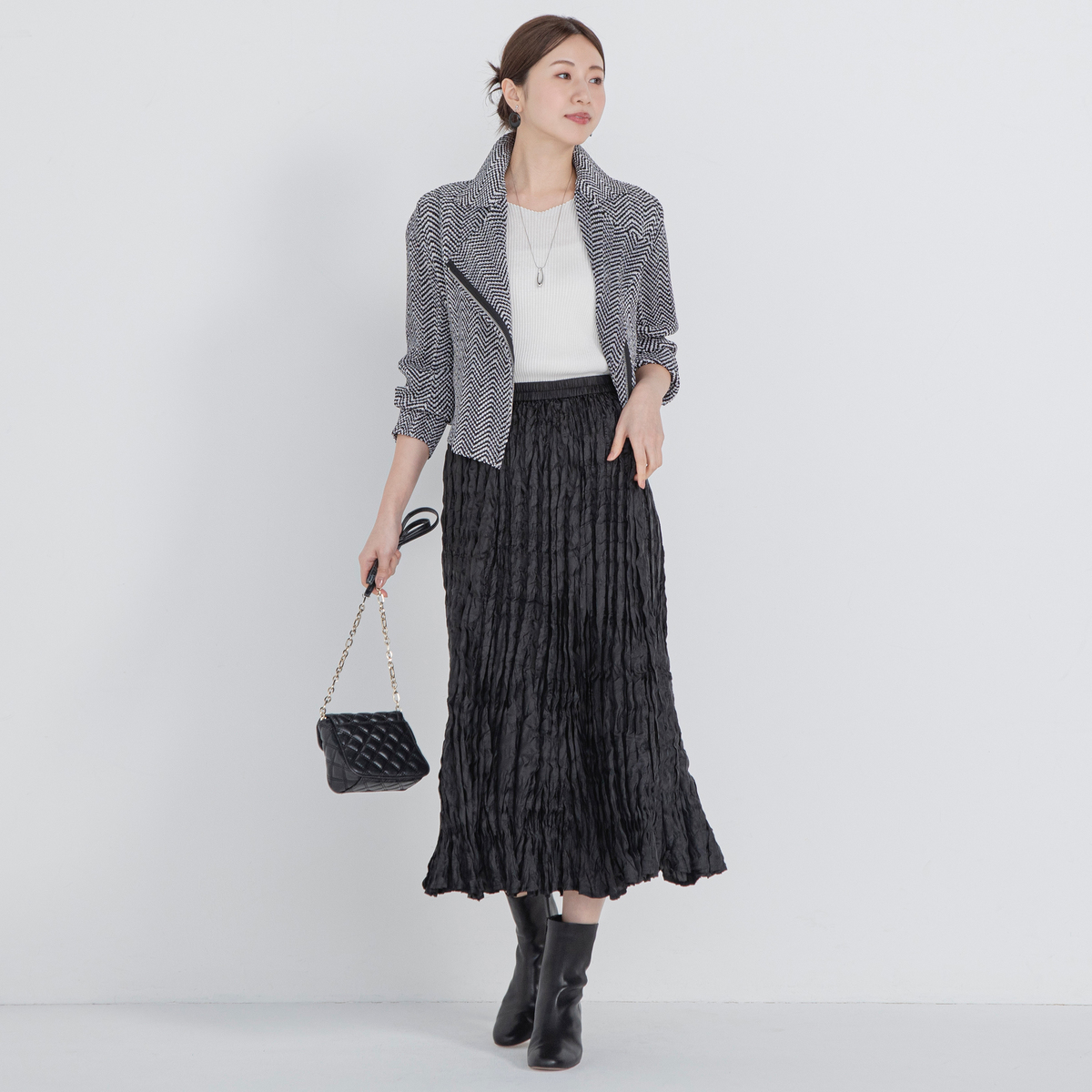 表情のあるプリーツが歩くたびに軽やかに揺れ、下半身のラインをさりげなくカバー。ブラック、グレージュ、格子柄、ブルーツィードの4色をご用意しました