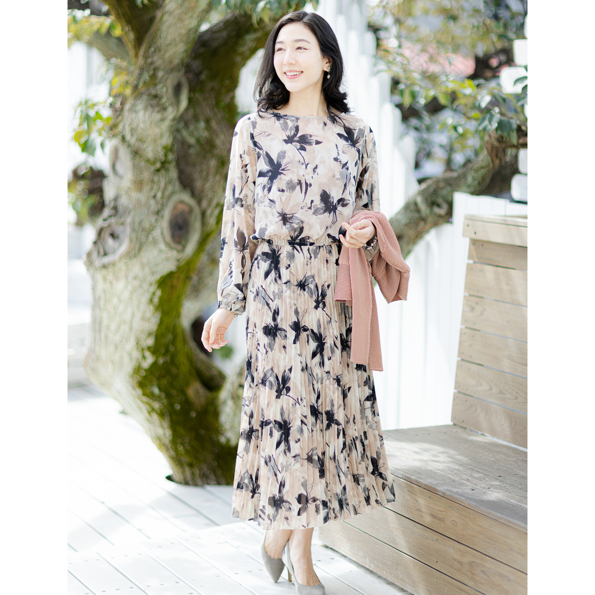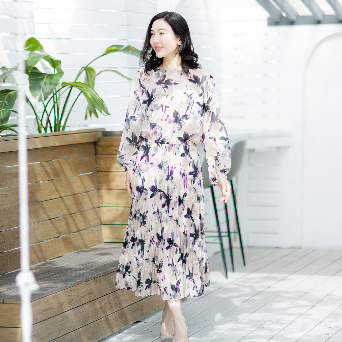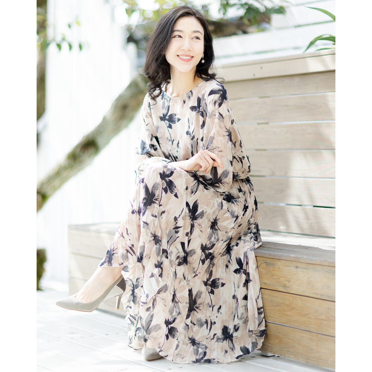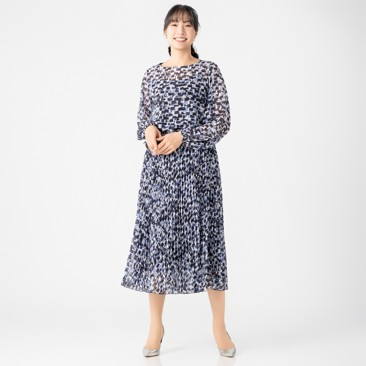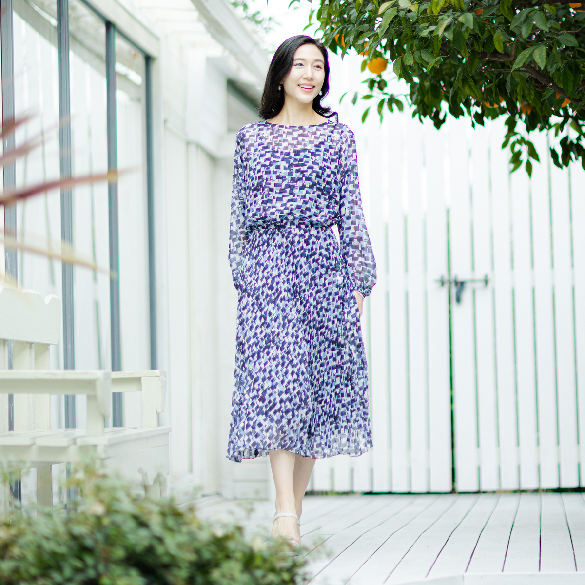 すとんと着るだけで、絵になるワンピース。アコーディオンプリーツ加工を施した柔らかさのあるシフォンプリーツのスカート部分が、軽やかさと立体感を演出します