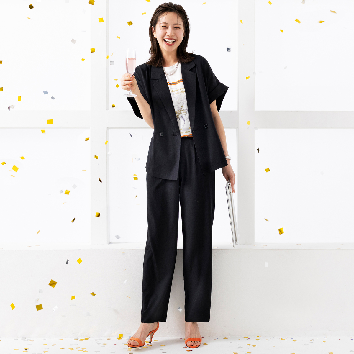 袖口を折り返したデザインのさっと羽織るタイプの半袖テーラージャケット。こなれ感のあるオーバーサイズで、手軽に着られてきちんと感も出るデザインです