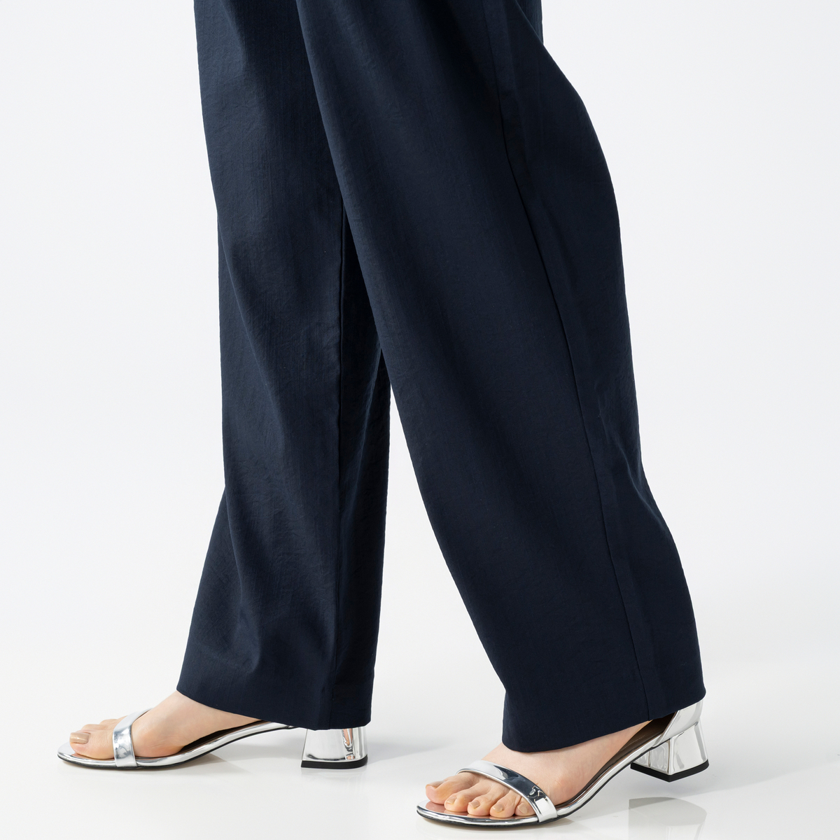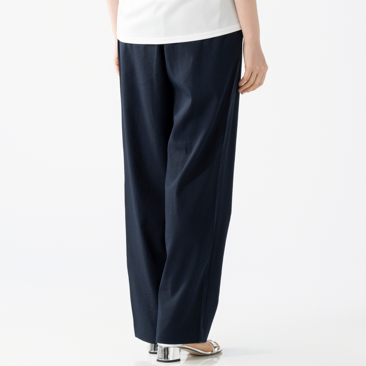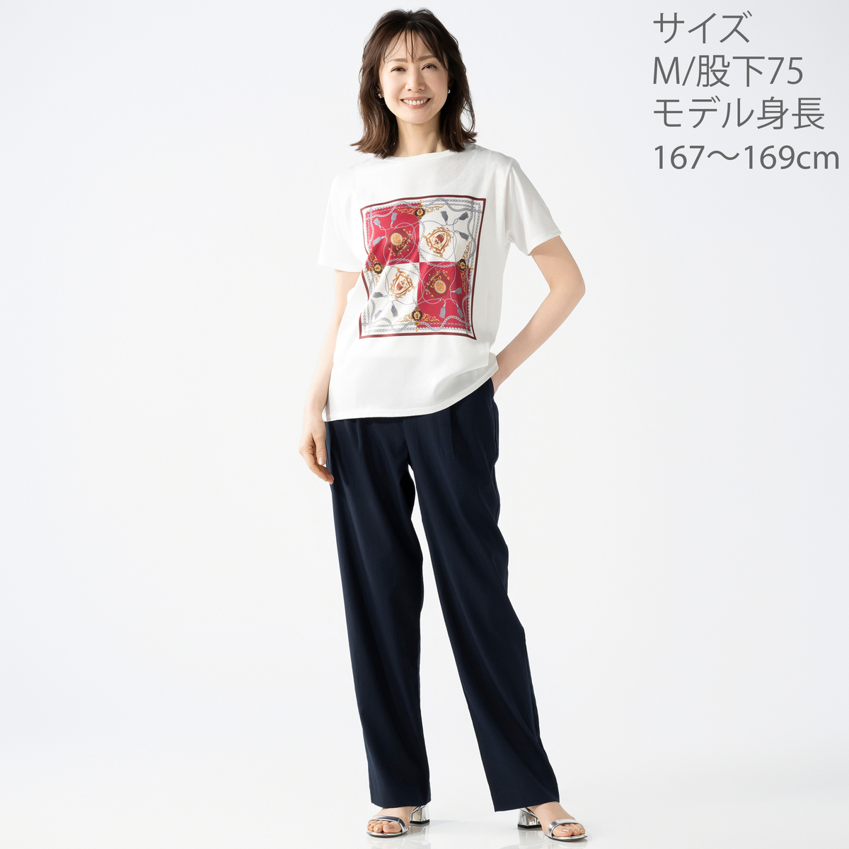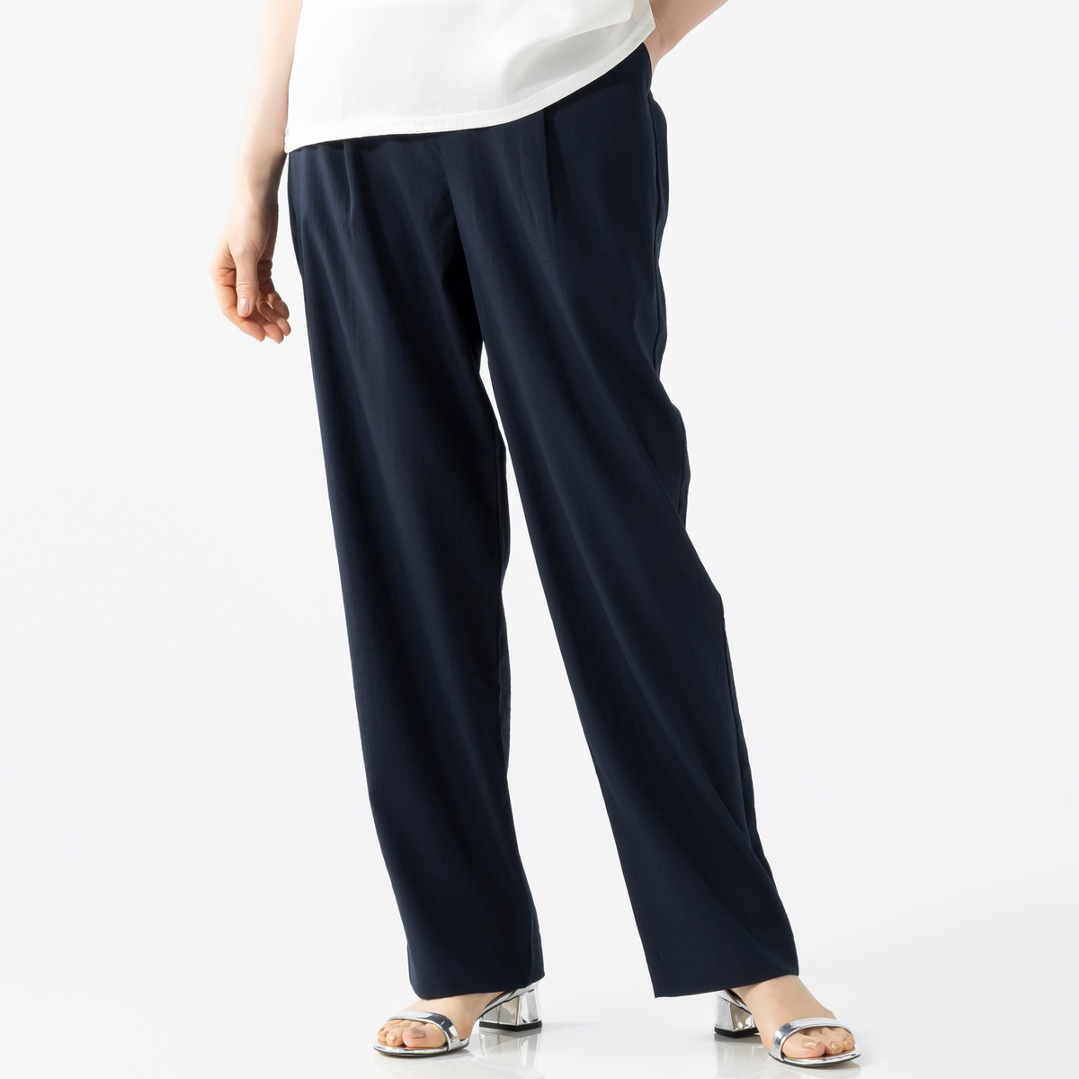 ウエストは総ゴム入りのプルオンウエスト。フロントはフラットですっきり見え、後ろはしっかりギャザーが入っており、窮屈感を感じにくく楽々の穿き心地です。フロントには1タックが入り、腰まわりにもゆとりを持たせています