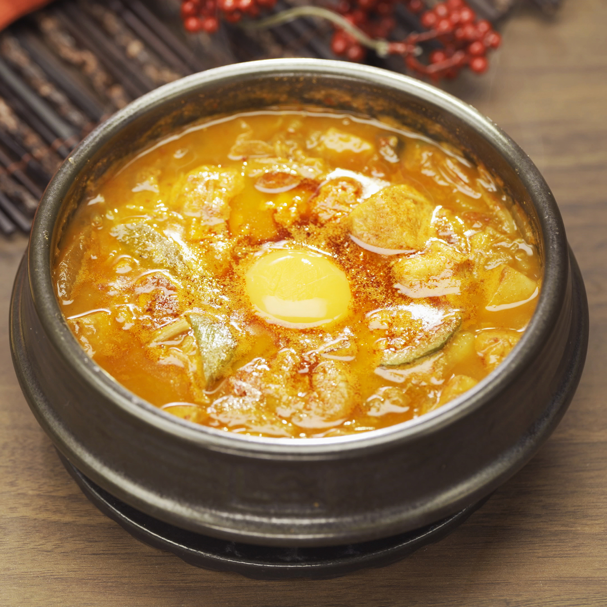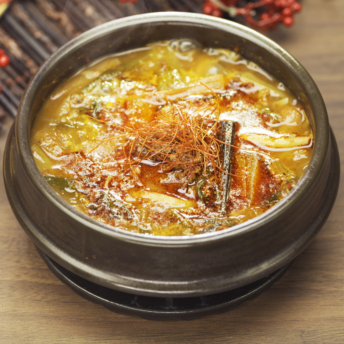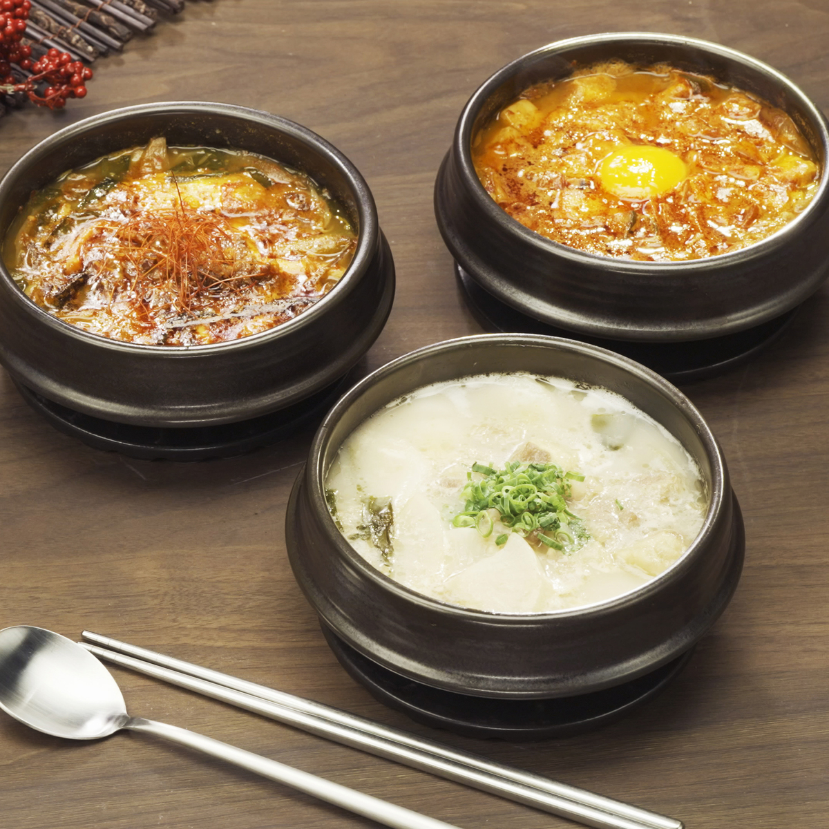 お肉や野菜が入った旨辛スープ。ユッケジャンスープ、海鮮スンドゥブ、コムタンスープの3種類をセットでお届けします