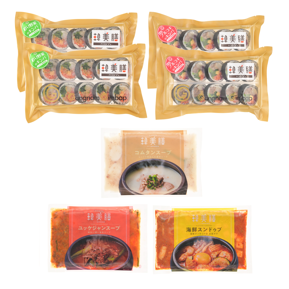 韓美膳のキンパ2種と、3種のスープを詰め合わせたセット。電子レンジで温めるだけで、手軽に美味しくお召し上がりいただけます