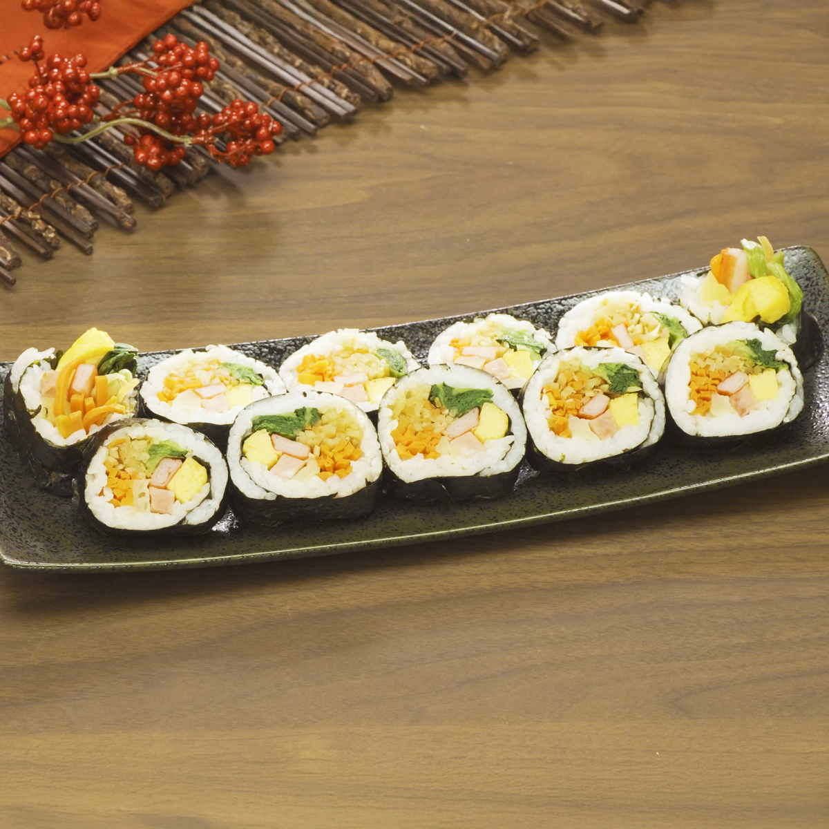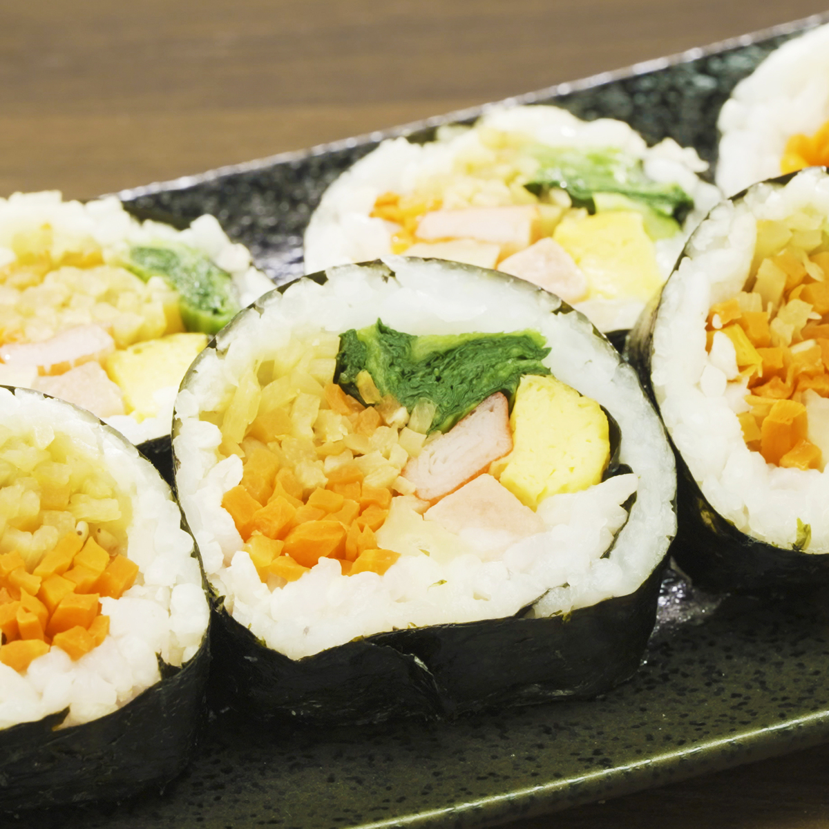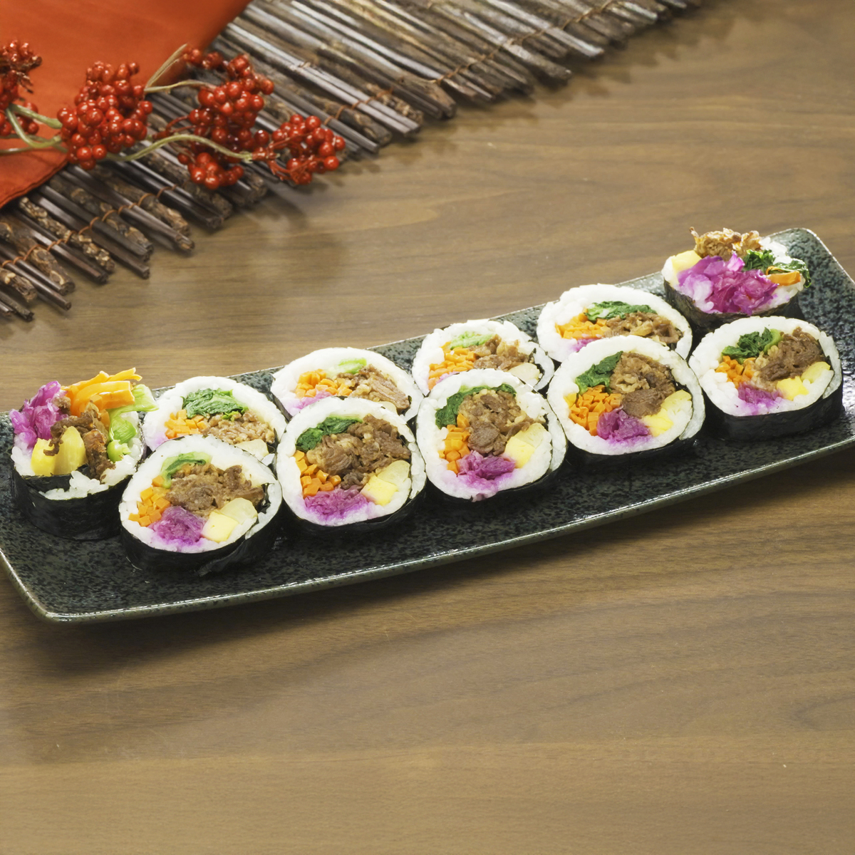 野菜を中心とした具材たっぷりのキンパ。彩り野菜のキンパと特製プルコギのキンパの2種類をセットでお届けします