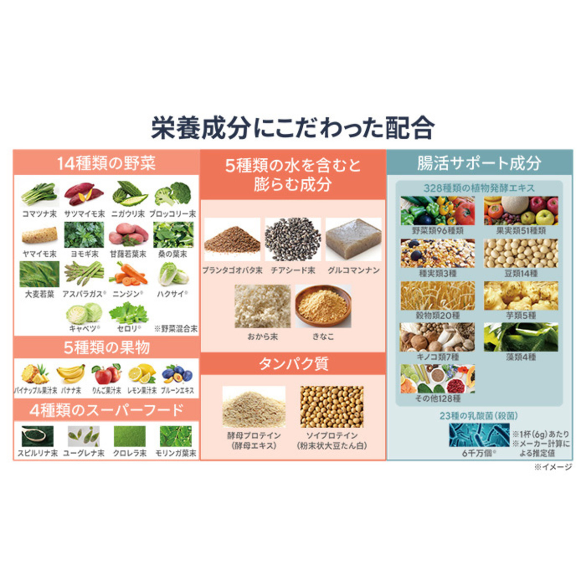 328種類の植物発酵エキス(*3)や23種の乳酸菌(*4)、水を含むと膨らむ原料5種(*5)やスピルリナ末、ユーグレナ末、クロレラ末、モリンガ葉末を組合せ、1食(6g)あたり約15kcalです