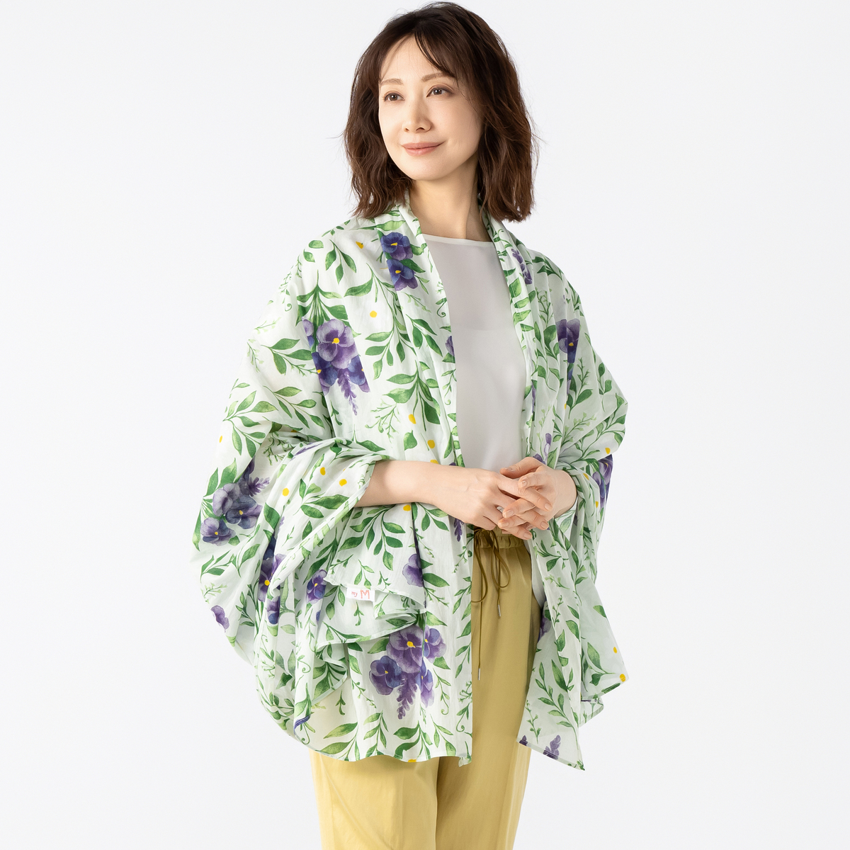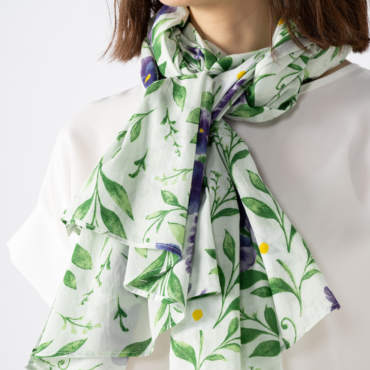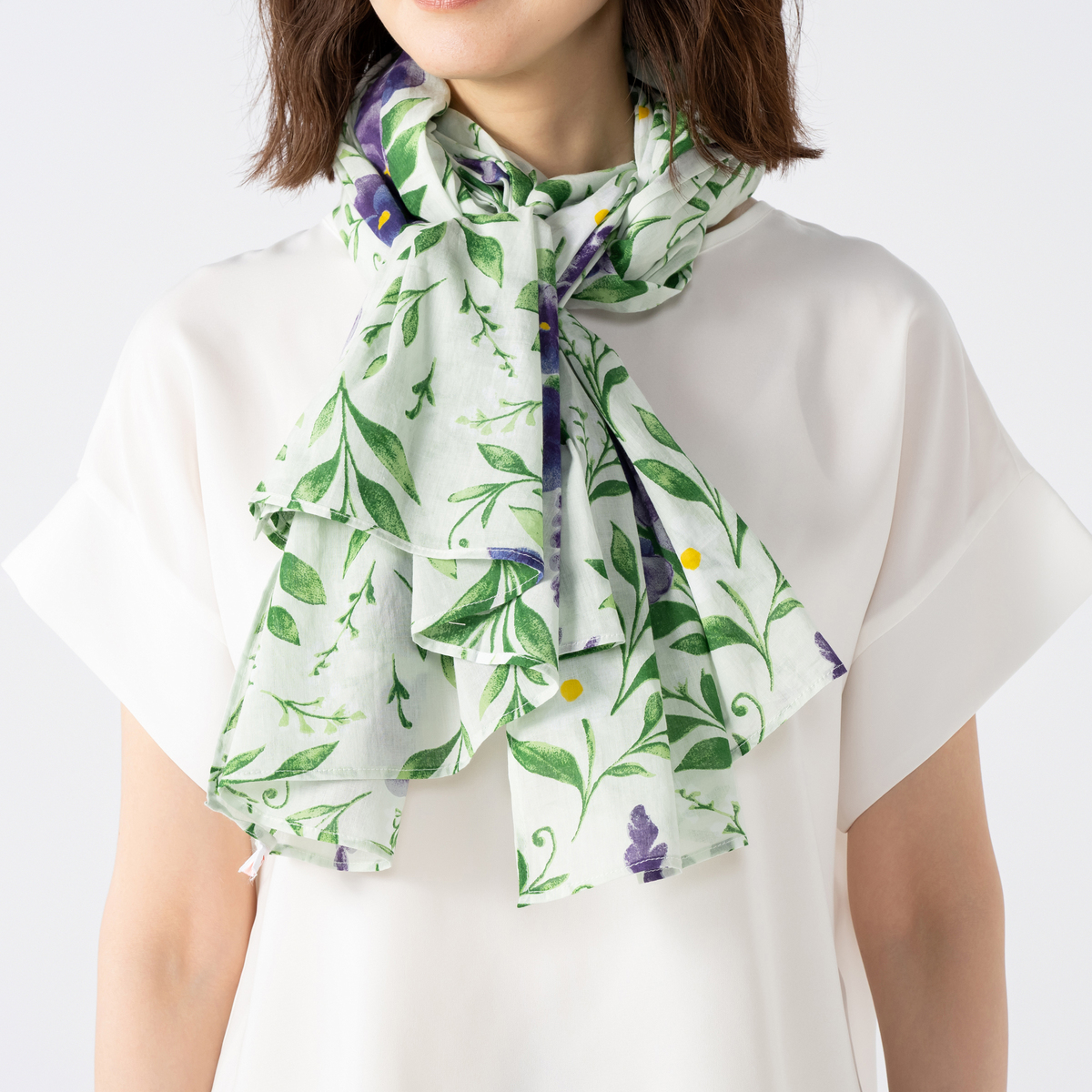 インド綿混素材を使用したストール。約180cm×105cmと大判サイズで、首元に巻いたり、広げて肩から掛け、お洋服のように見せるアレンジも楽しめます
