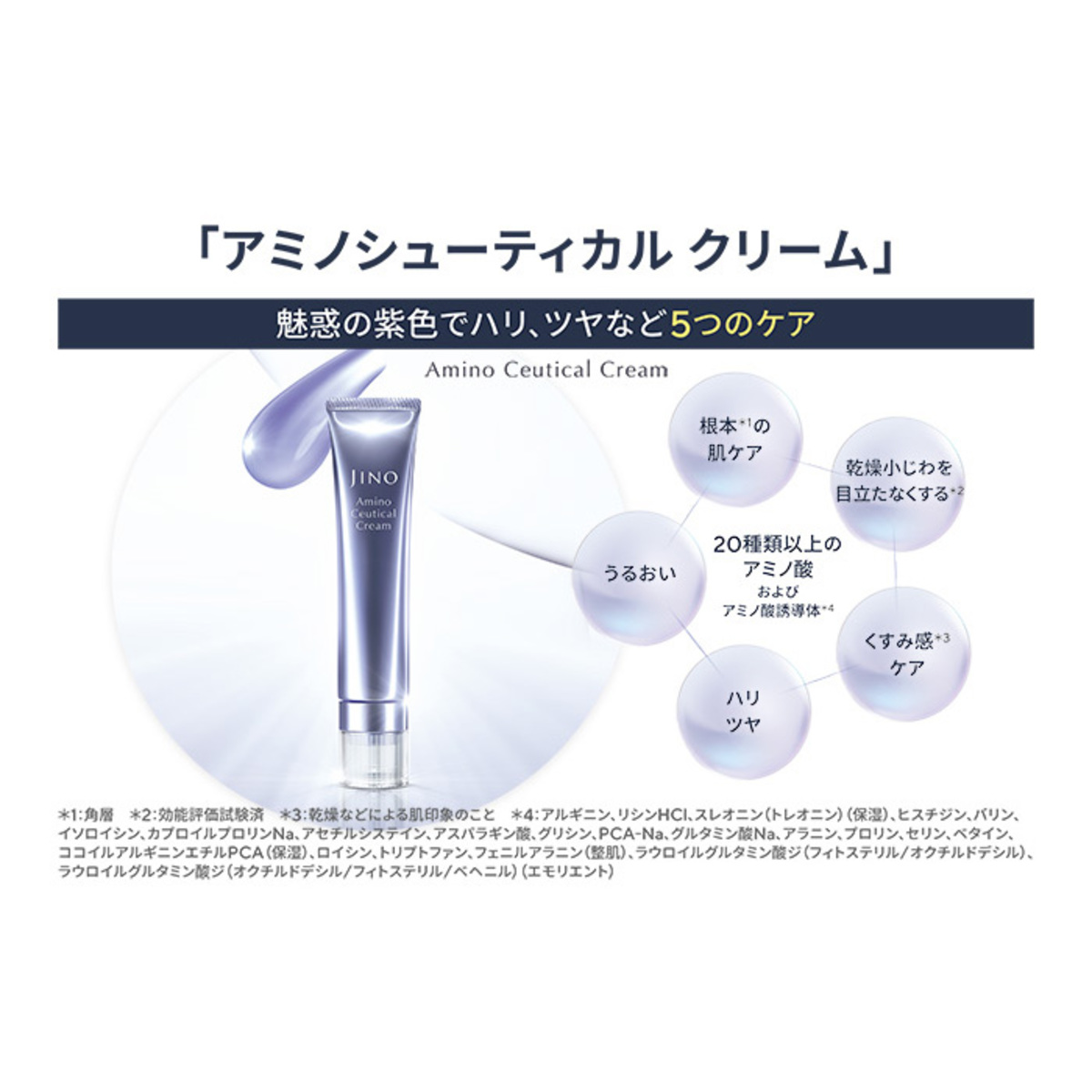 20種類以上のアミノ酸とアミノ誘導体を配合したクリーム。ブランド内で最多種・最大量のアミノ酸を含み、角層のうるおいケアをサポートする3種のアミノ酸(*1)を配合。乾燥による肌荒れを防ぎます。紫色は植物フタバガキ由来のグアイアズレン(*2)によるもので、整肌成分として働きます