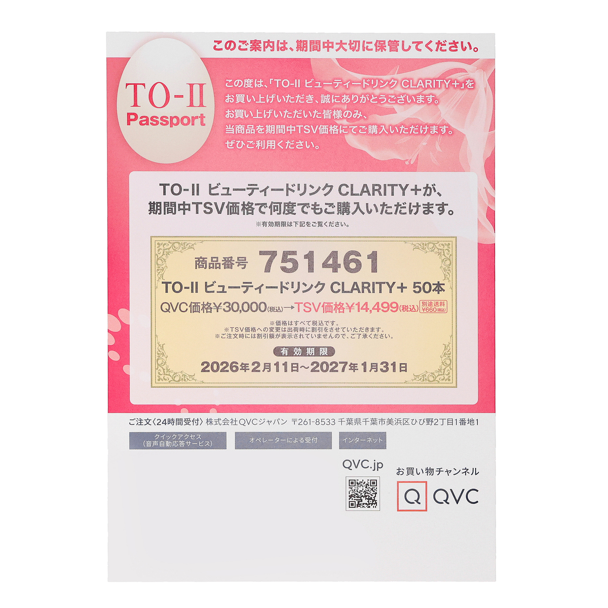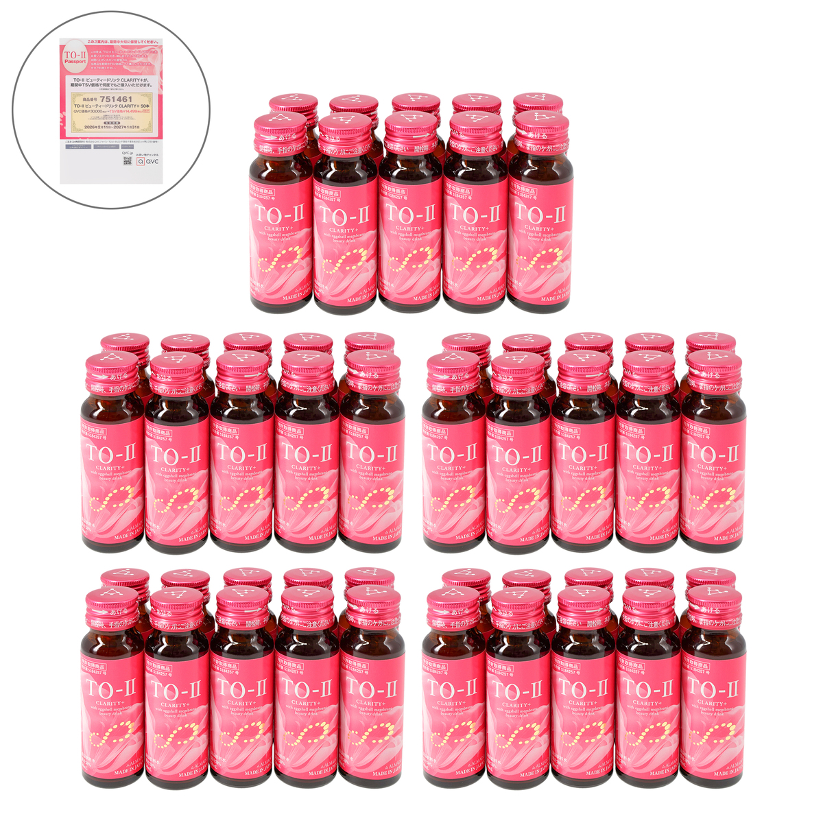 [商品内容] ・TO-II ビューティードリンク CLARITY+ (50ml×10本)×5 ・TO-III ビューティードリンク CLARITY+パスポート (プレゼント) [原材料] りんご果汁(ニュージーランド製造)、フラクトオリゴ糖、水解卵殻膜粉末、玄米黒酢、鶏胸肉抽出物(アンセリン・カルノシン15%含有)、フィッシュコラーゲンペプチド、卵殻膜粉末、N-アセチルグルコサミン、ナツメ抽出物、キダチアロエ抽出物、鶏軟骨エキス、プロテオグリカン含有サケ鼻軟骨抽出物、卵白カラザ粉末、ローヤルゼリー、 アセロラ粉末、トウモロコシ胚芽抽出粉末/トレハロース、乳酸、香料、V.C、安定剤(大豆多糖類)、ユッカ抽出物、ヒアルロン酸、甘味料(スクラロース、ステビア)、クエン酸鉄Na、V.B2、V.E、貝Ca、(一部にえび・かに・卵・さけ・大豆・鶏肉・りんご・ゼラチンを含む)