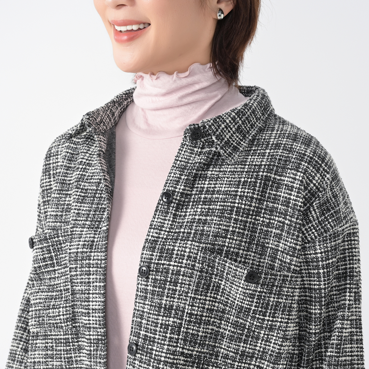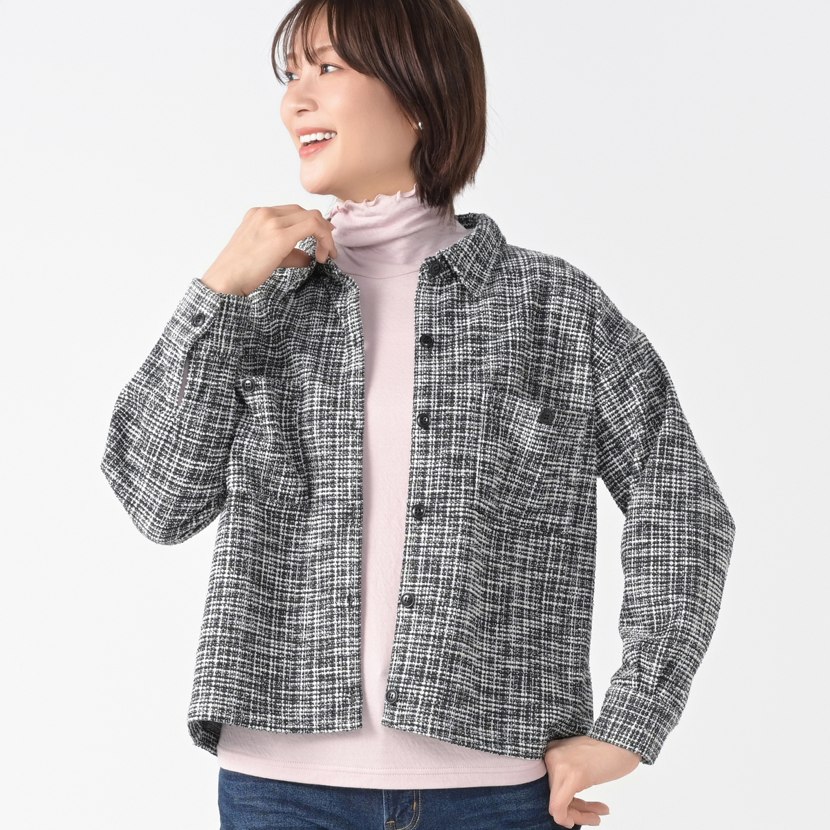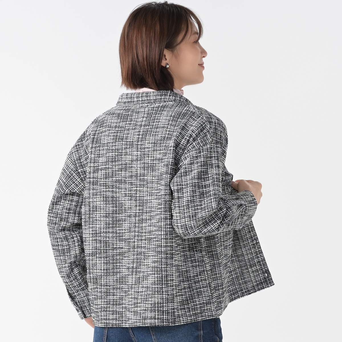 ざっくりとしたツイード調の生地で仕立てたジャケット。フォーマルすぎずラフすぎない絶妙なバランスに仕上げました。シャツのように気軽に羽織れるアイテムです
