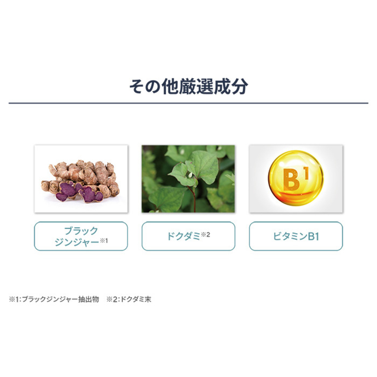 ブラックジンジャー抽出物×ビタミンB1や、難消化性デキストリン×ドクダミ末を配合しています
