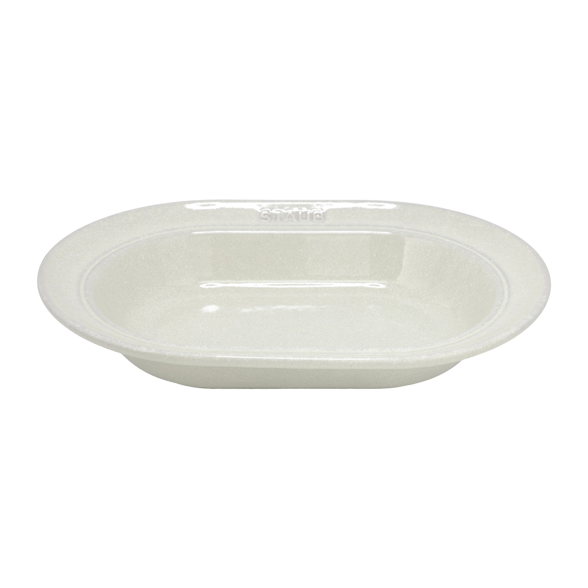 深みのある楕円形が特徴のセラミック皿。電子レンジで使用でき、温めや調理に便利です。直火やオーブンは使えませんが、シンプルなデザインと落ち着いた質感で、日常の食卓を上品に演出します