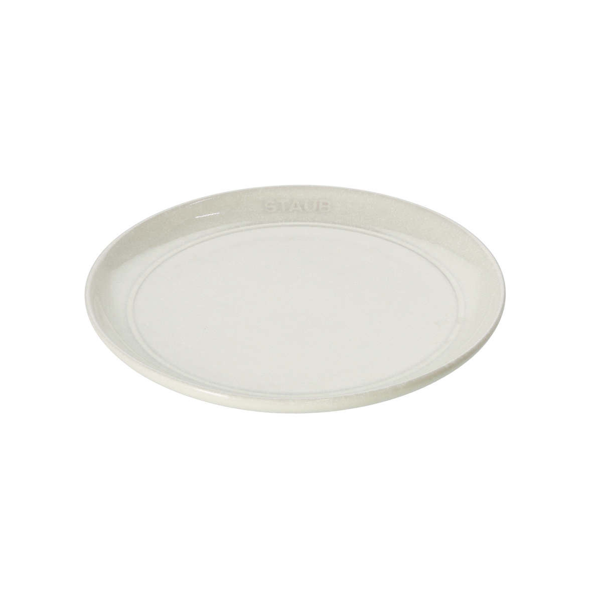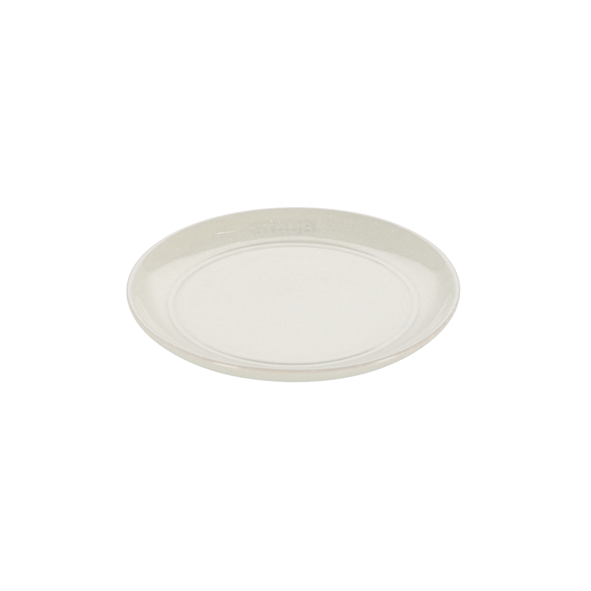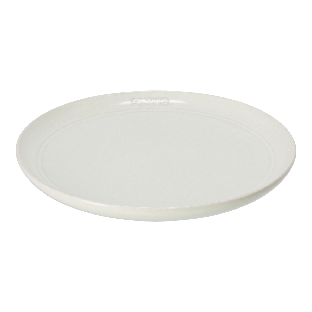 フラットなセラミック皿。電子レンジで使用でき、温めや調理に便利です。直火やオーブンは使えませんが、シンプルなデザインと落ち着いた質感で、日常の食卓を上品に演出します