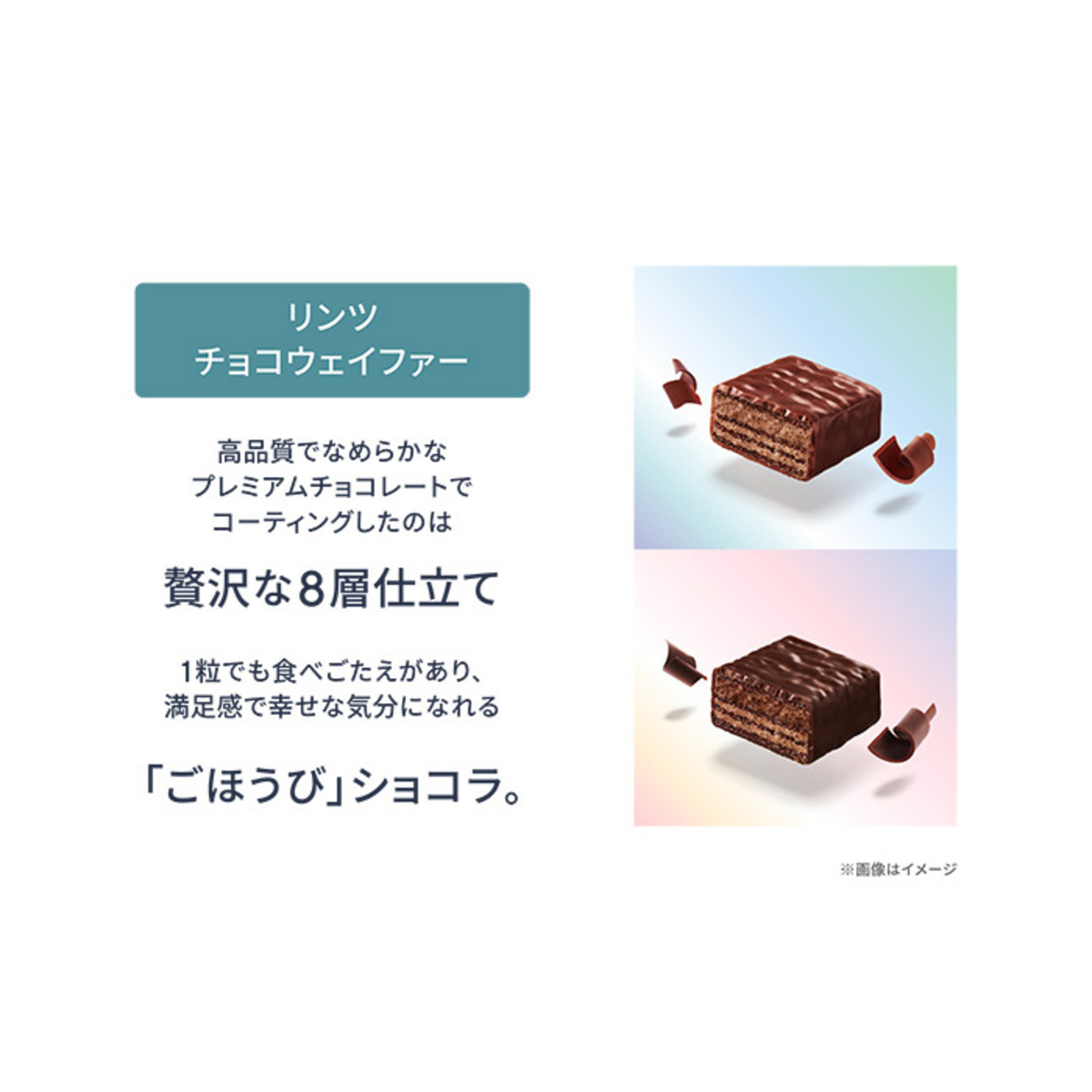高品質でなめらかなプレミアムチョコレートでコーティングされた贅沢な8層仕立てのショコラ。サクッとした食感に続いて、プレミアムチョコレートのなめらかでコクのある味わいが楽しめます。1粒でも食べごたえがあり幸せな気分になれる「ごほうび」ショコラです