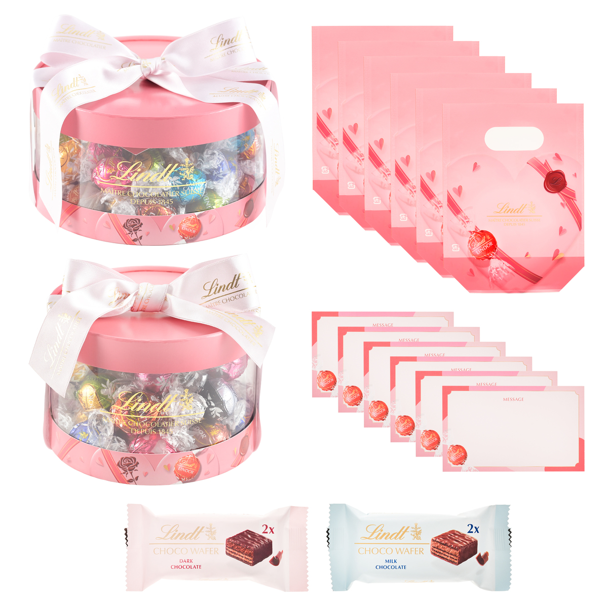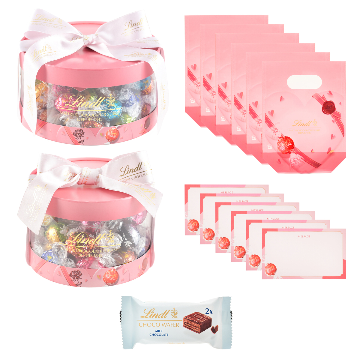 ちょっとした手土産も作れるセット。最大6個のリンドールを入れられる小分け袋付きで、赤いリボンと季節感を演出するタグでラッピングが楽しめます。さらに、メッセージカードも同梱。小分け袋、メッセージカードは、店頭・オンラインショップでも販売していないQVC限定品です