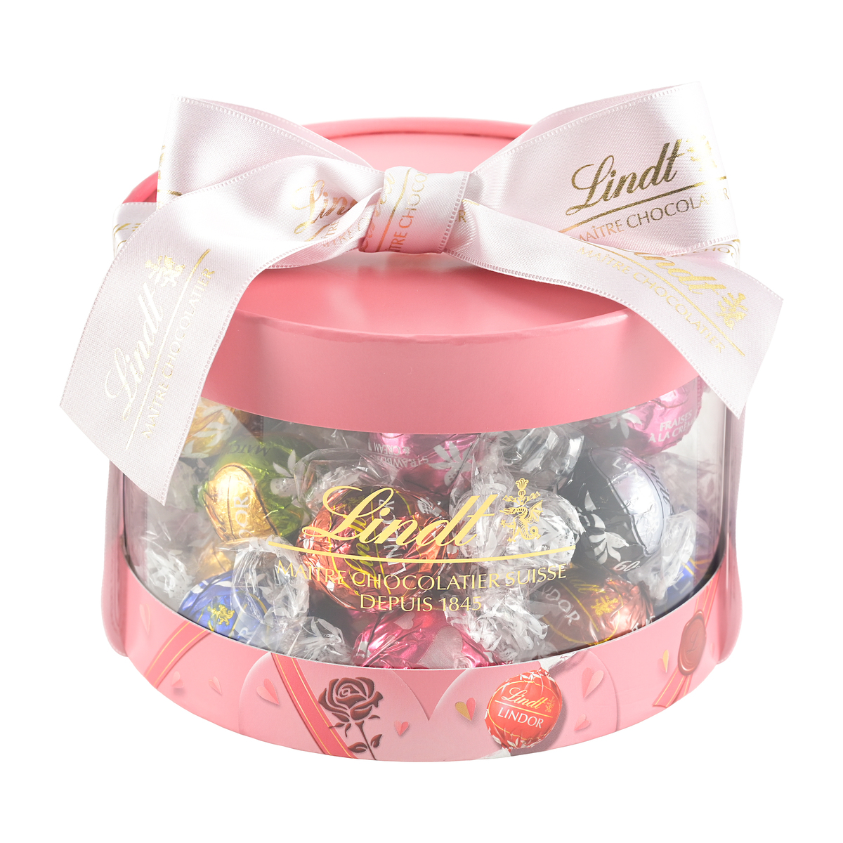 バレンタインデザインのパッケージに、QVC限定カラーのリンツロゴ入りリボンをあしらった特別なギフトボックス。定番の人気フレーバー16種に、季節限定フレーバー1種を加えた贅沢なアソートです