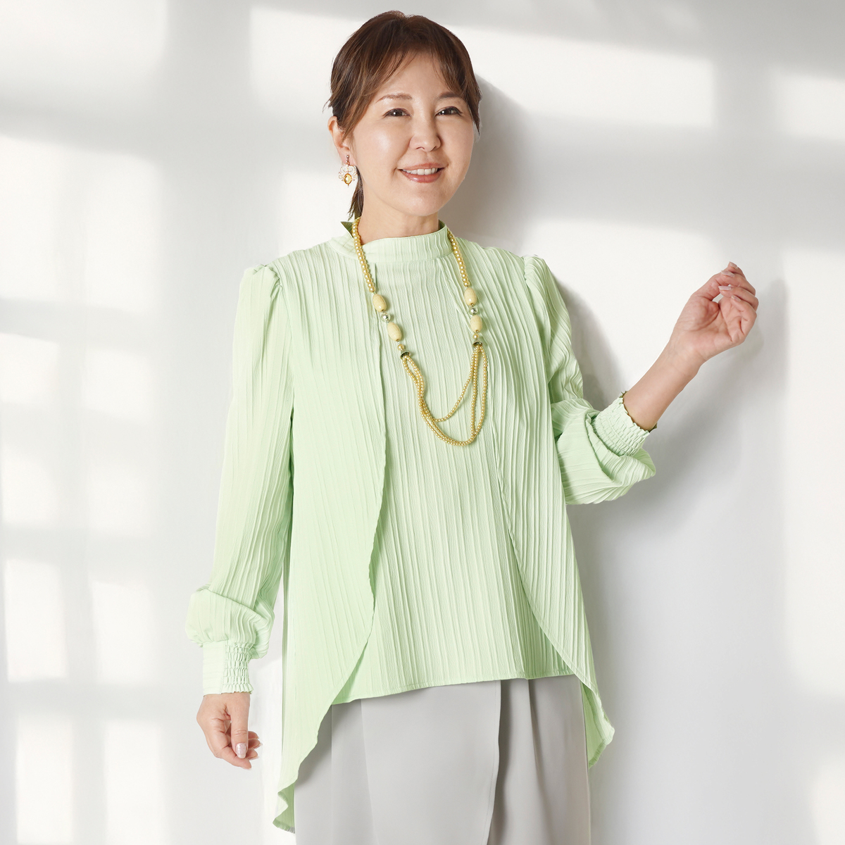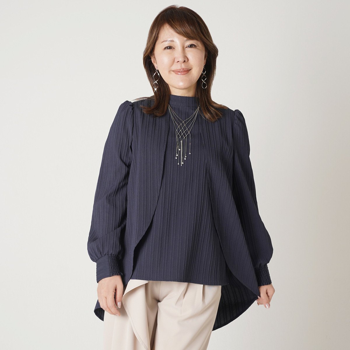 前身頃が重なり合うラップ風の切替とハイネックが特徴のブラウス。流れるようなシルエットがコーデをエレガントに彩ります