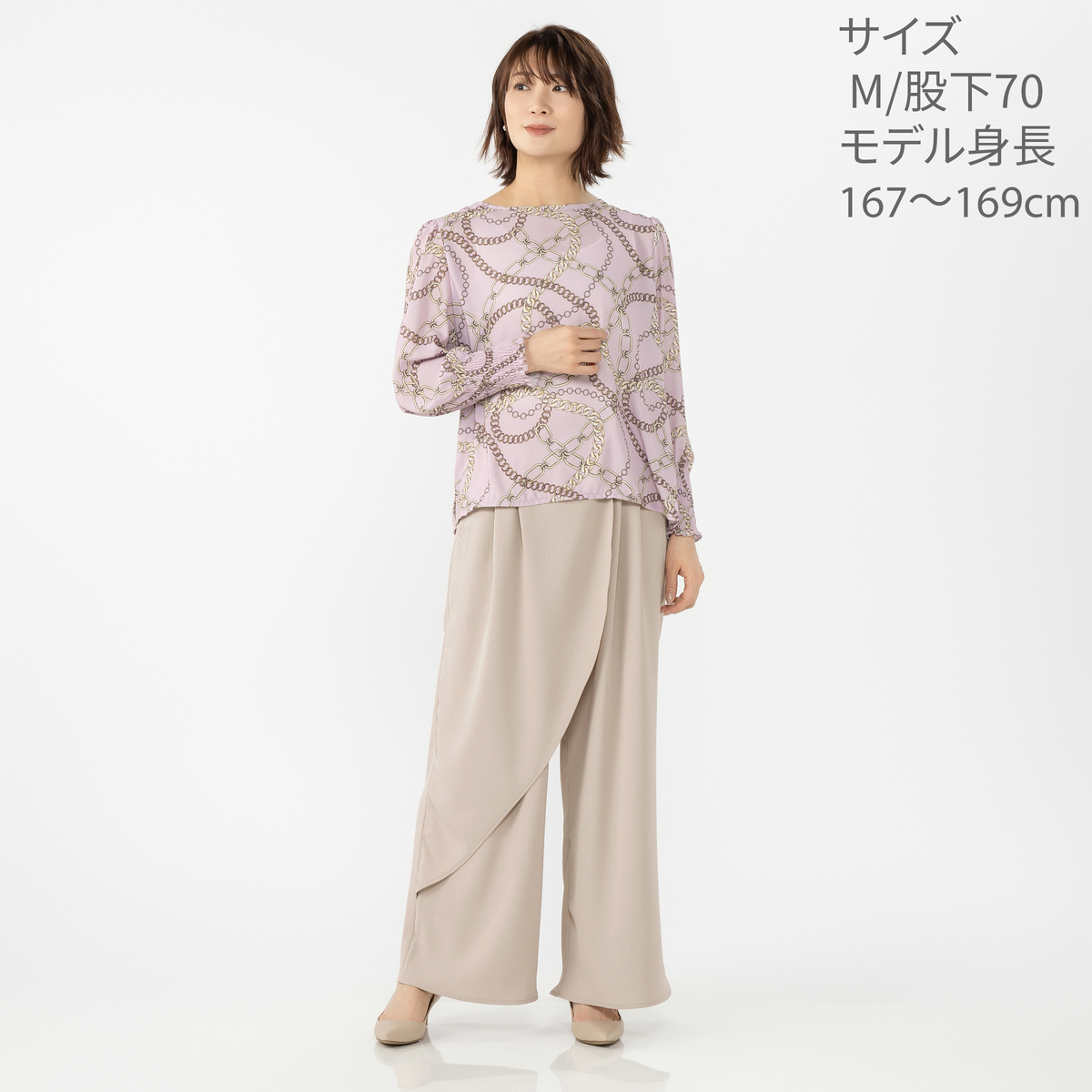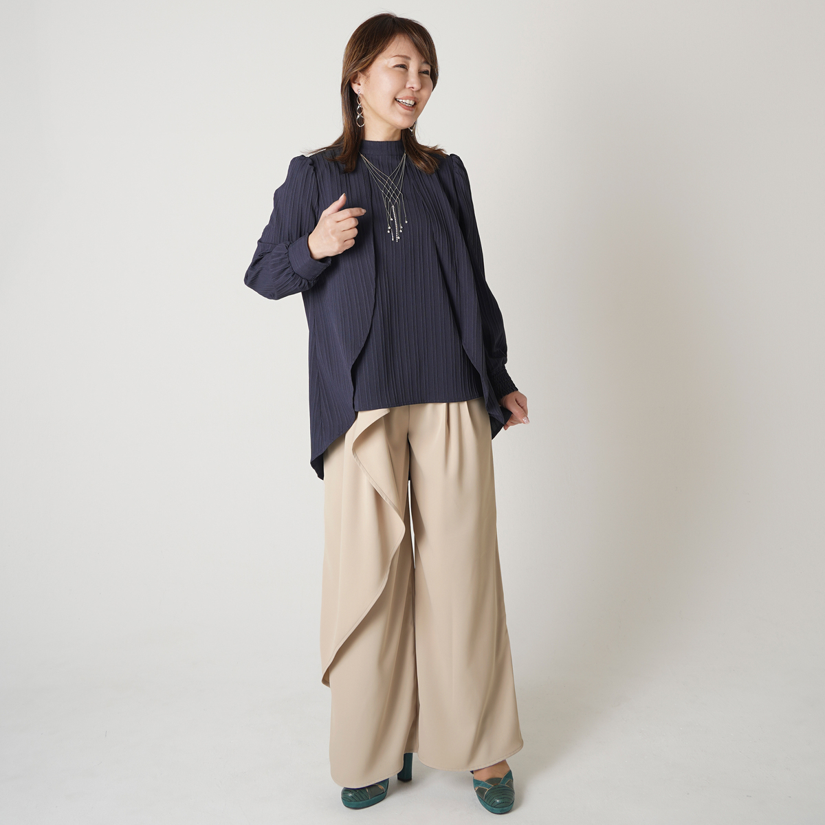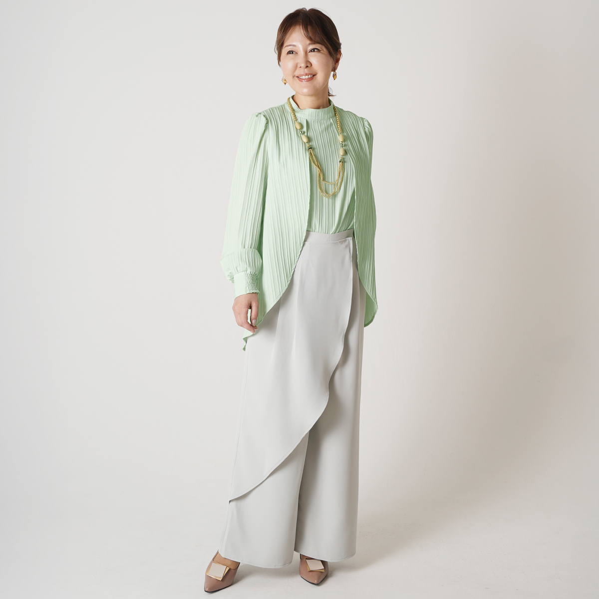 軽やかでさらりとした肌触りと、美しいドレープ感が特徴のポリエステルツイル素材を使用。UVカット、防シワ、吸水速乾、ピリングができにくい特性も備えた、扱いやすい素材です
