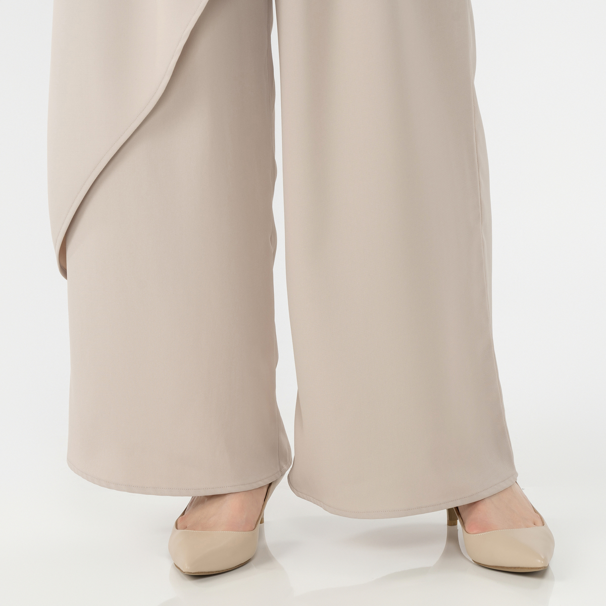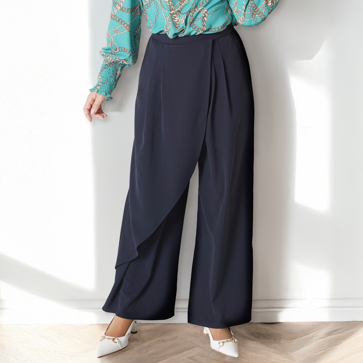 独創的なアシンメトリーデザインが特徴のラップパンツ。右脚側を覆う大きなラップ布が揺れ、歩くたびに柔らかなドレープが生まれます。ややゆとりのあるストレートに近いシルエットで、ラップが加わることで穏やかなフレア感も楽しめます
