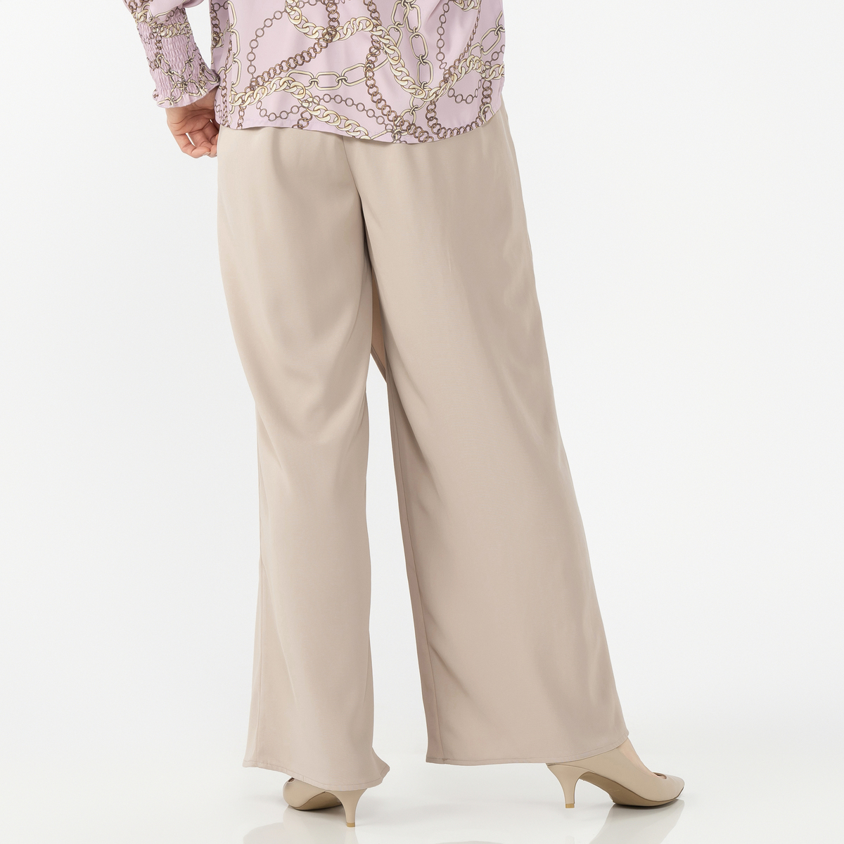 ウエストは全周ゴムで、後ろにたっぷり入れたギャザーで着脱もスムーズ。前はギャザーを抑え、腰回りがもたつきにくい仕立てに。左右の片倒しタックが縦のラインを整え、中縫いによって形を保ち、すっきりとしたシルエットになります