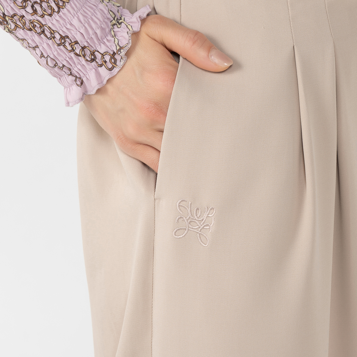 ラップ布の裏側の三角布にボタンを設け、外してラップ布を垂らすなどのアレンジが楽しめます。両脇にはシームポケット付きで、外側からは目立ちにくく、アシンメトリーなラップデザインの洗練された印象を損なわない仕様です