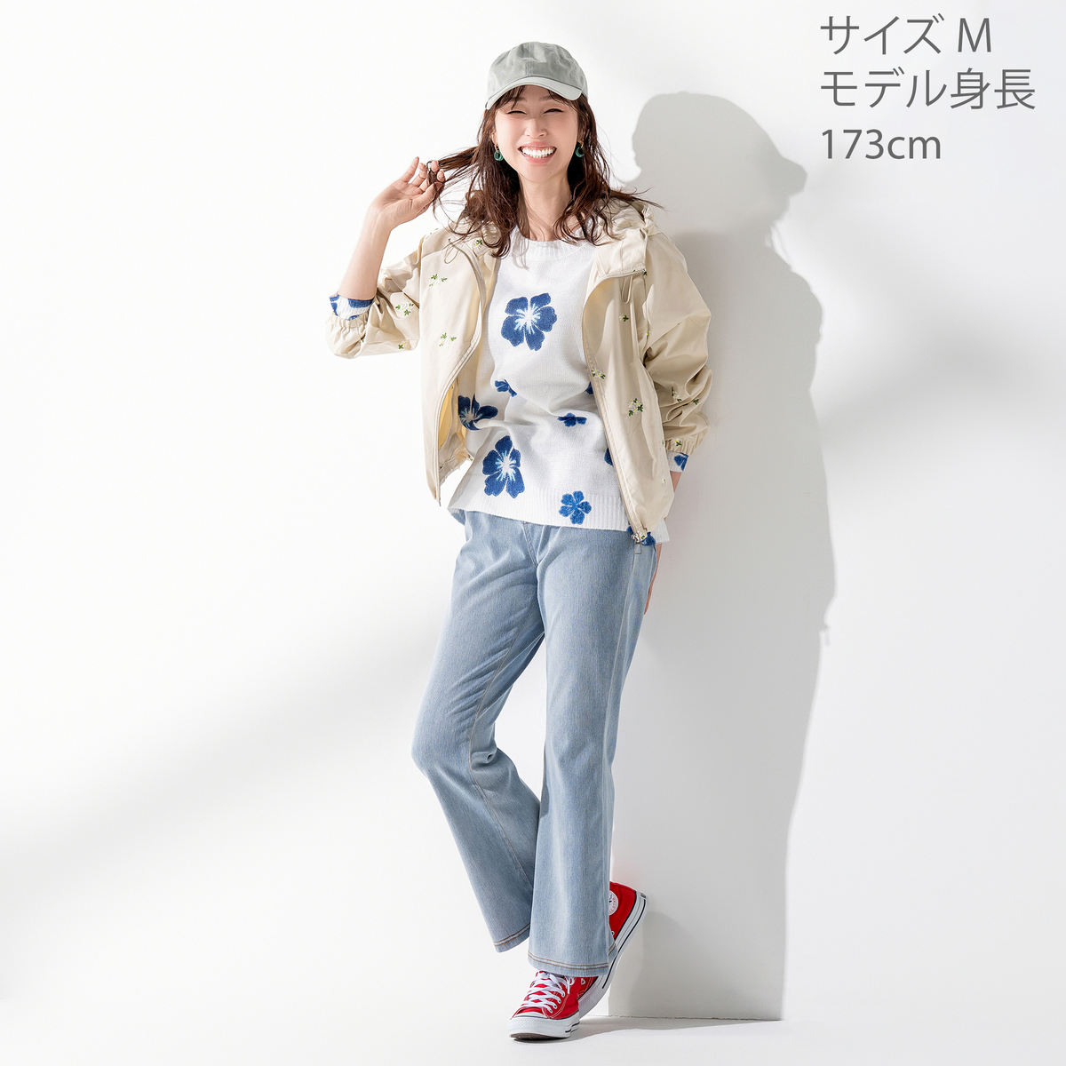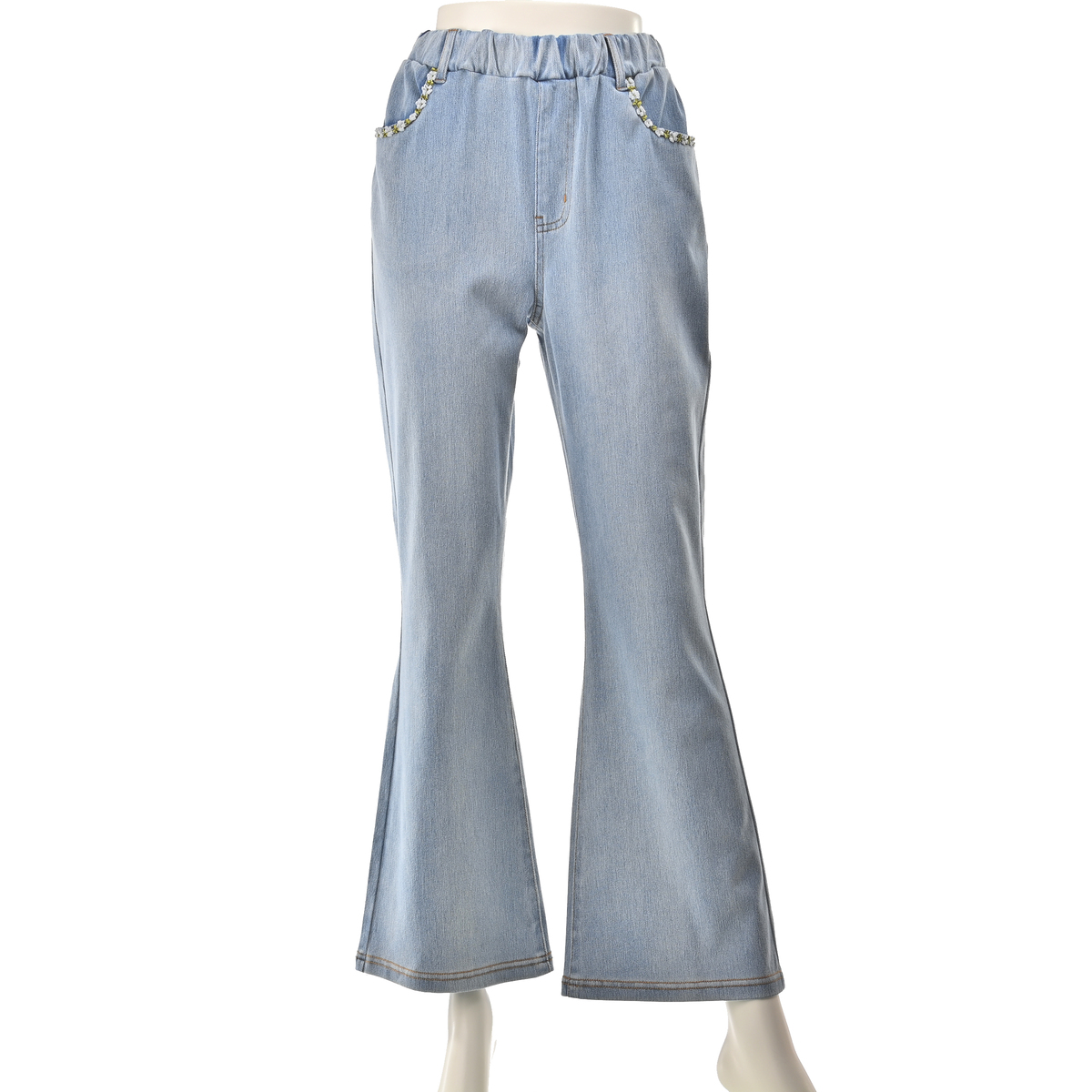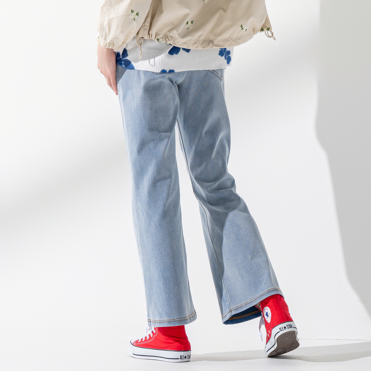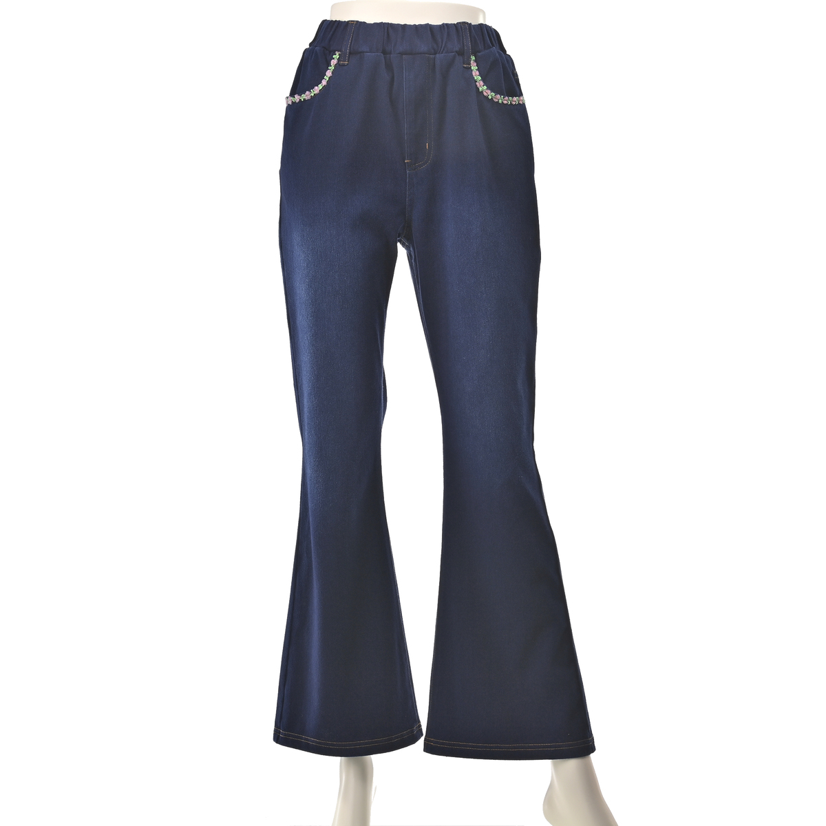 花のテープ装飾を添えたデニムニットパンツ。カジュアルな質感に華やぎを添えながら、フレアラインが脚をきれいに見せてくれます。足元次第で雰囲気が変わり、着こなしの幅が自然と広がります