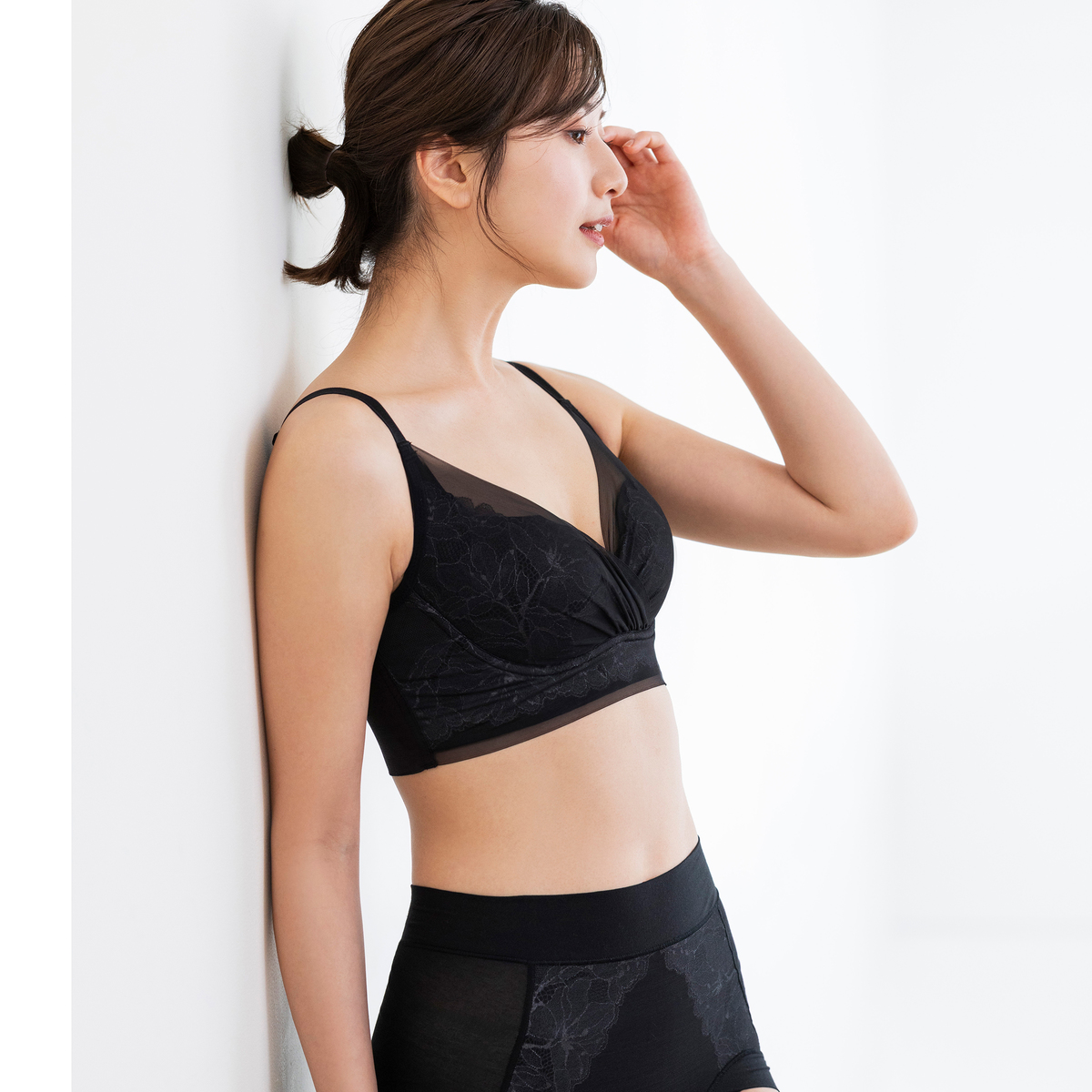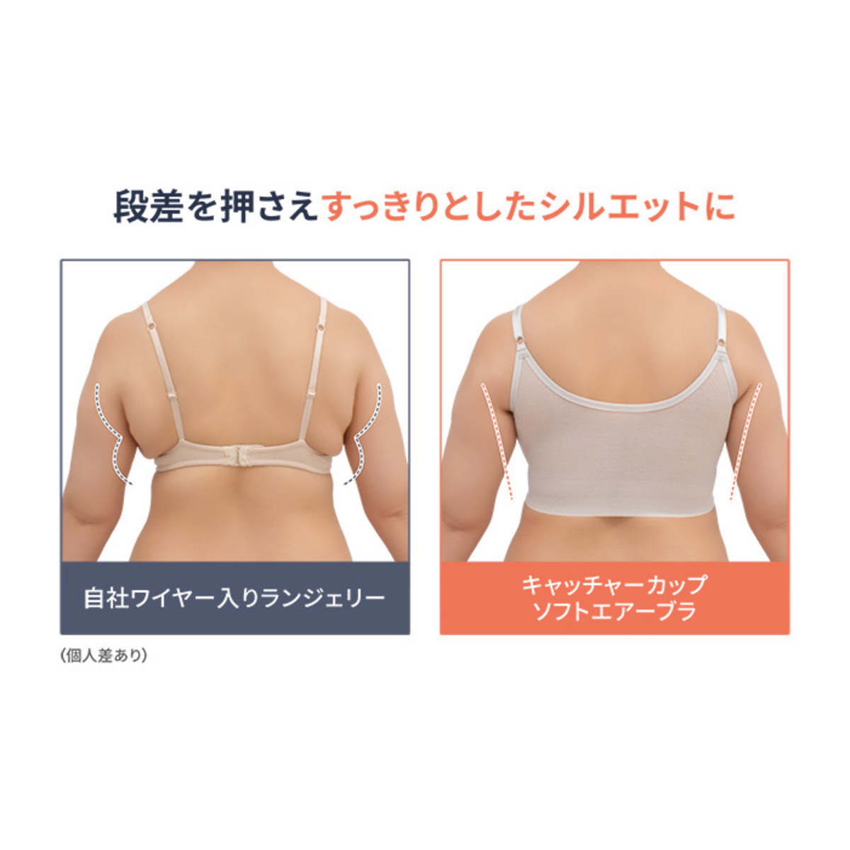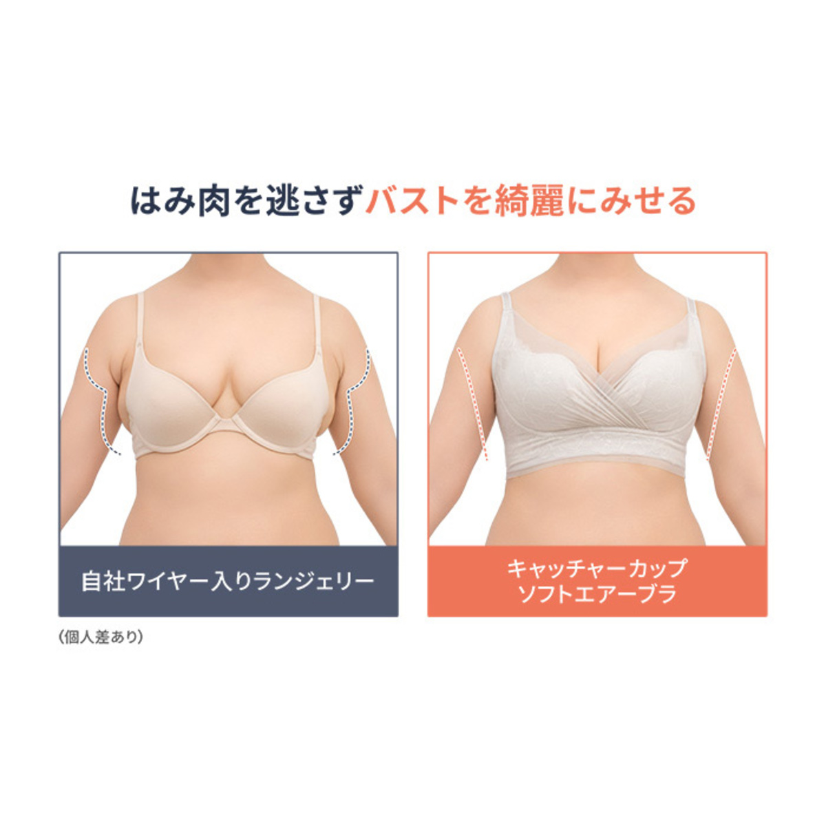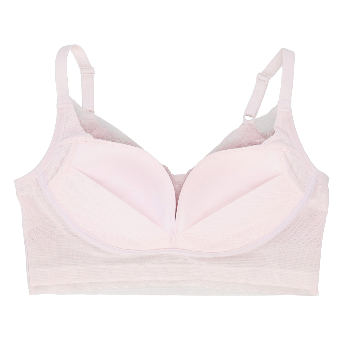 まるでワイヤーブラのようにバストメイクする、オリジナルの立体設計ブラパターンを採用。しなやかなフィット感で楽な着心地とバストアップ機能を両立。カップの前中心は縫い合わせることで、カップが横に広がりにくく、きれいなバストシルエットをキープします