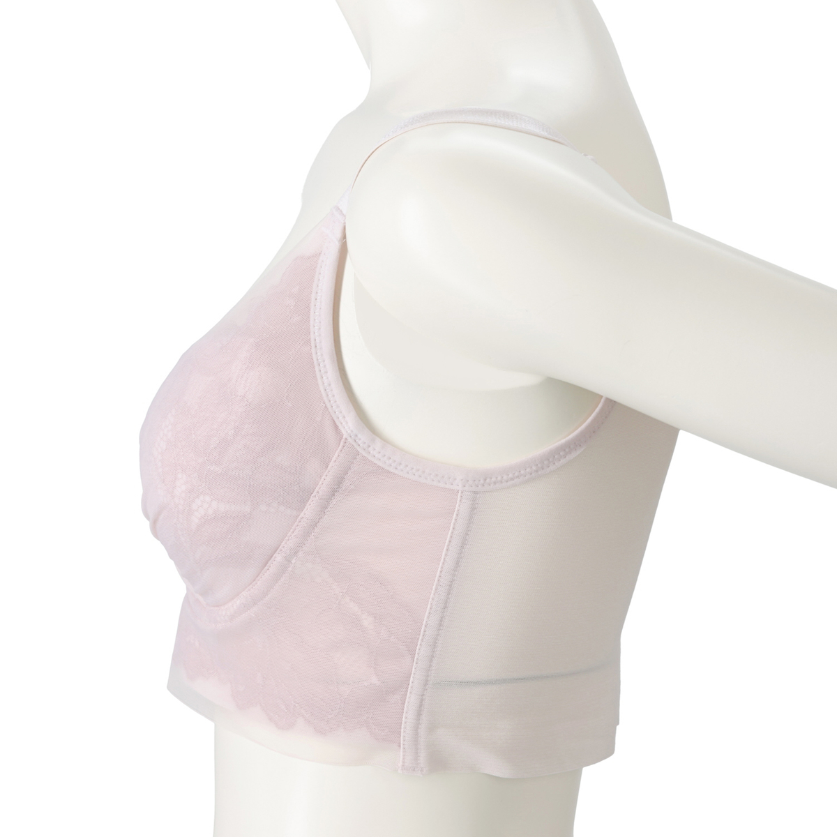 身生地は、ソフトでなめらかな肌触りの綿混ヘムパワーネット****。キックバック性のあるポリウレタン糸により、締め付け感なくバストラインを整えます。通気性のあるメッシュ素材で汗ばむ季節も快適です