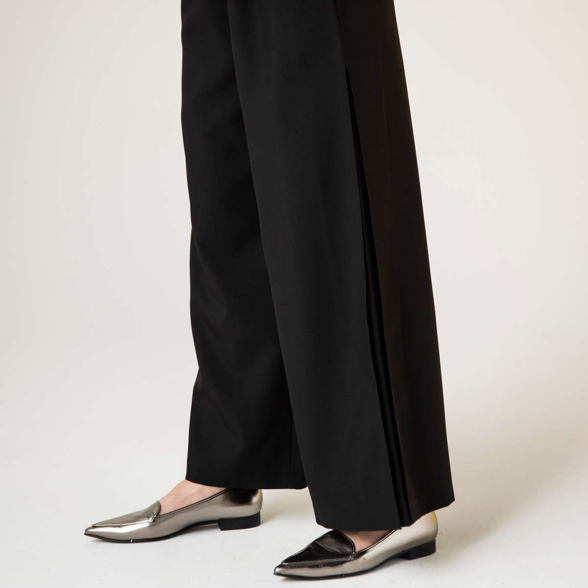 サイドにタックを施し、美しいシルエットに仕上げたワイドパンツ。縦のラインを強調し、脚長効果が期待できます