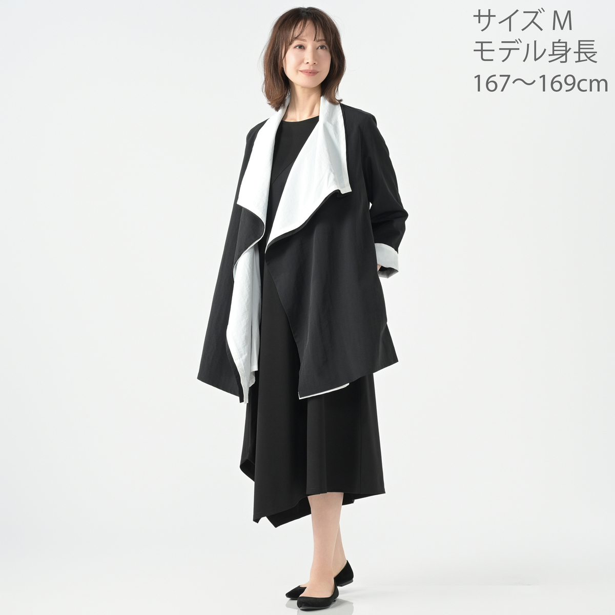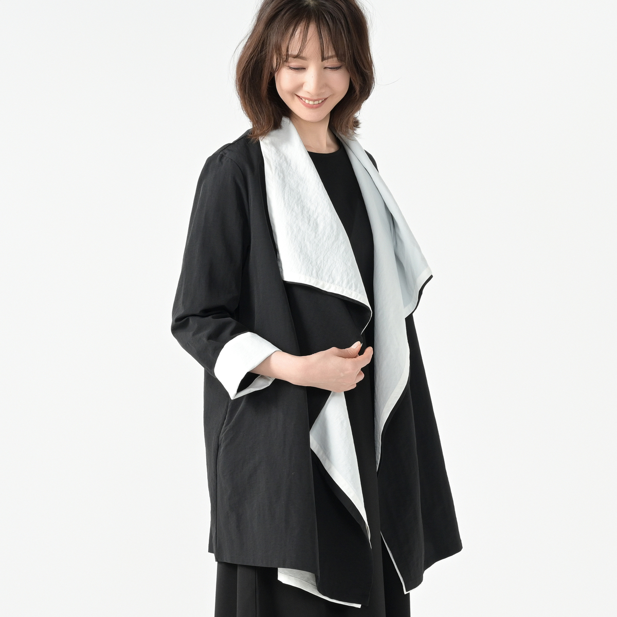 上品なワイドカラーで、シンプルなインナーやパンツと合わせるだけでスタイリッシュな装いに。オフィスやランチ、ちょっとした集まりなど幅広いシーンで活躍します