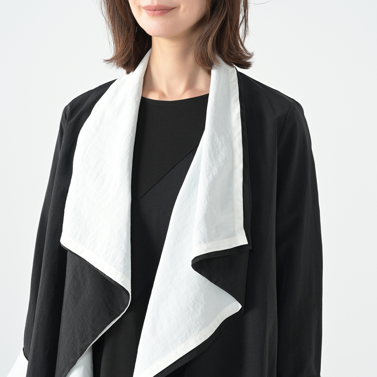 2重の大きな衿が印象的なレイヤードジャケット。ブティックジュンコならではのデザインが、お顔まわりを華やかに見せ、小顔効果も期待できます