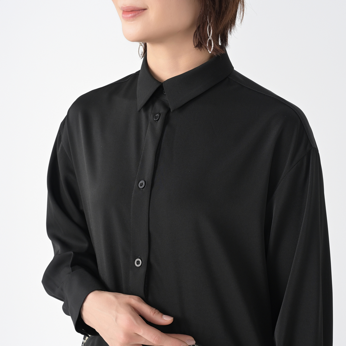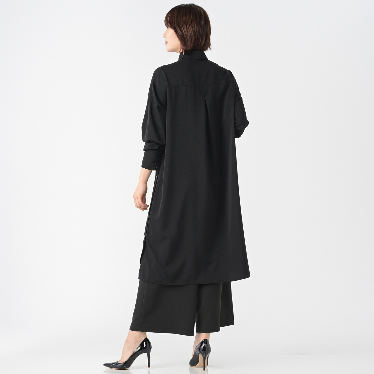 ワンピースとして一枚で着ても、羽織として重ね着しても、洗練された雰囲気に。シンプルながらも個性が光るシルエットです
