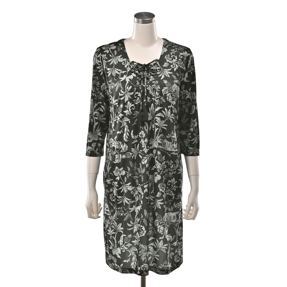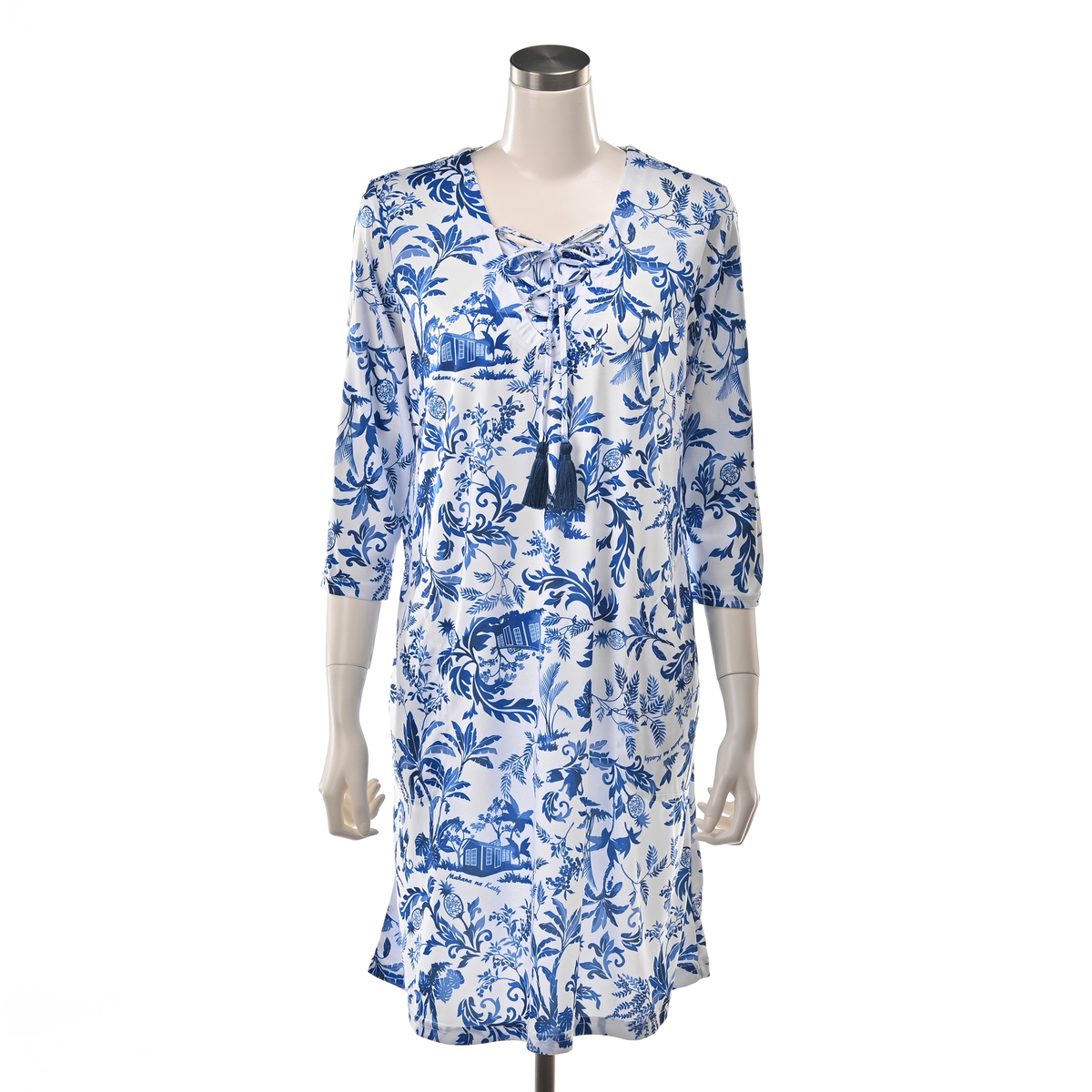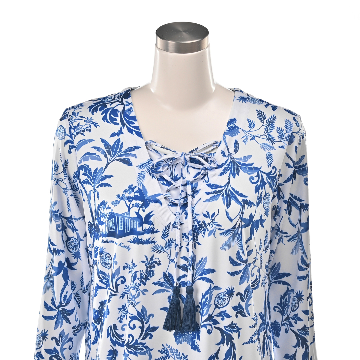 エキゾチックなプリントチュニック。胸元のレースアップとタッセルがアクセントです。プリントはハワイアンコロニアル様式のカフェとパイナップルを描いたオリジナルの柄です