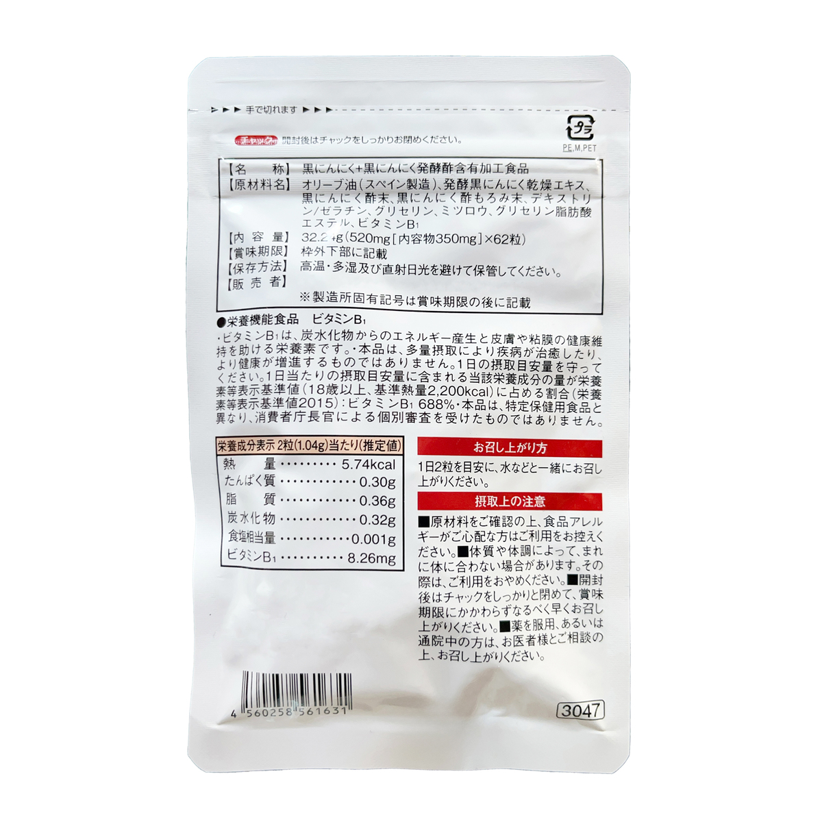 [アレルギー物質特定原材料8品目] なし [内容量] 62粒 [目安量] 1日2粒 [保存方法] 高温・多湿及び直射日光を避けて保管してください [お召し上がり方] 1日2粒を目安に、水などと一緒にお召上がりください [注意事項] ※薬を服用、あるいは通院中の方は、お医者様とご相談の上、お召し上がりください ※本品は、多量摂取により疾病が治癒したり、より健康が増進するものではありません。1日の摂取目安量を守ってください ※本品は、特定保健用食品と異なり、消費者庁長官による個別審査を受けたものではありません ※特定の疾病で使用不可ということはありませんが、過剰摂取にならないように注意してください ※原材料をご確認の上、食品アレルギーがご心配な方はご利用をお控えください ※体質や体調によって、まれに体に合わない場合があります。その際は、ご利用をおやめください ※開封後はチャックをしっかりと閉めて、賞味期限にかかわらずなるべく早くお召し上がりください ■栄養機能食品(ビタミンB1) ビタミンB1は、炭水化物からのエネルギー産生と皮膚や粘膜の健康維持を助ける栄養素です [原料原産地] オリーブ油(スペイン製造) [原産国] 日本 [原材料]オリーブ油(スペイン製造)、発酵黒にんにく乾燥エキス、黒にんにく酢末、黒にんにく酢もろみ末、デキストリン/ゼラチン、グリセリン、ミツロウ、グリセリン脂肪酸エステル、ビタミンB1