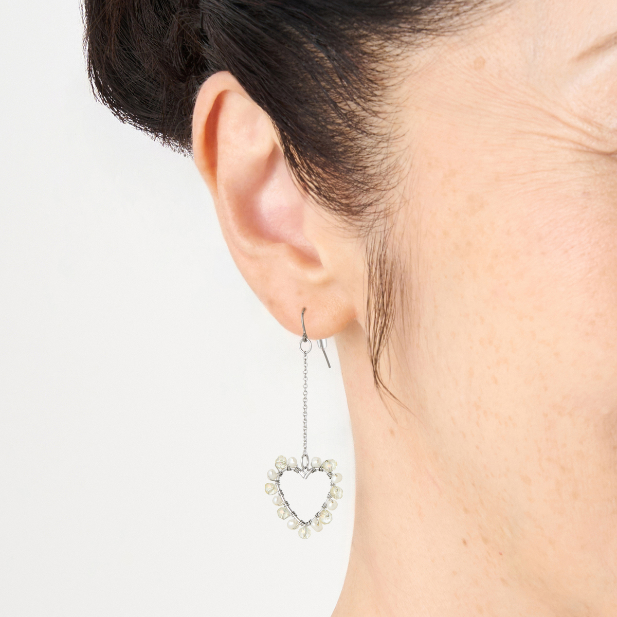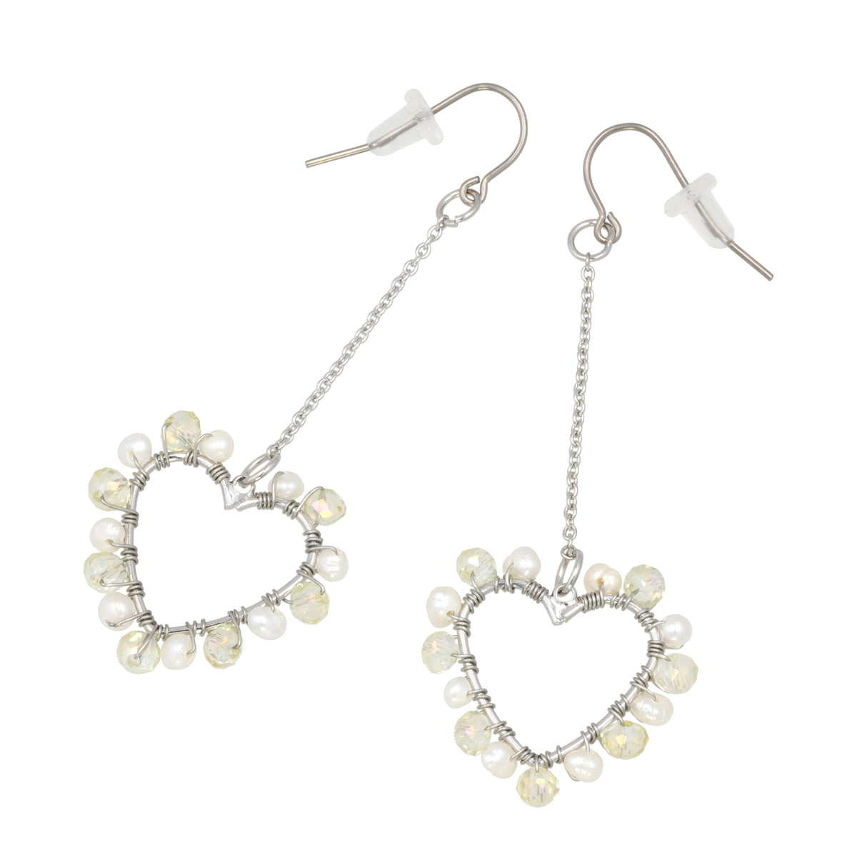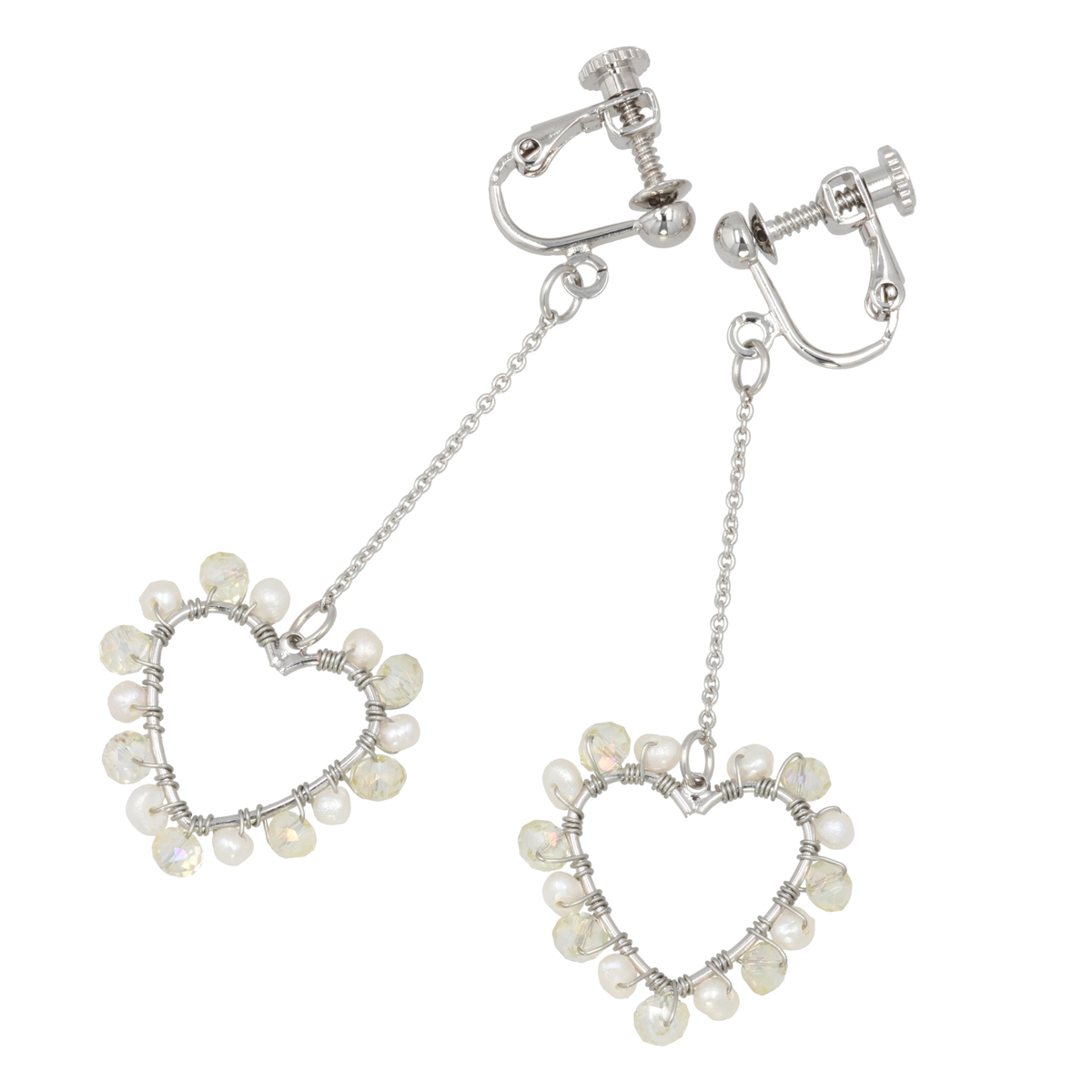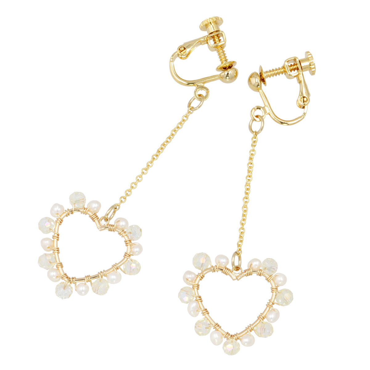 淡水パールとカットガラスが織りなす、上品なオープンハートのイヤリングまたはピアス。可愛らしさと落ち着きのある絶妙なデザインです