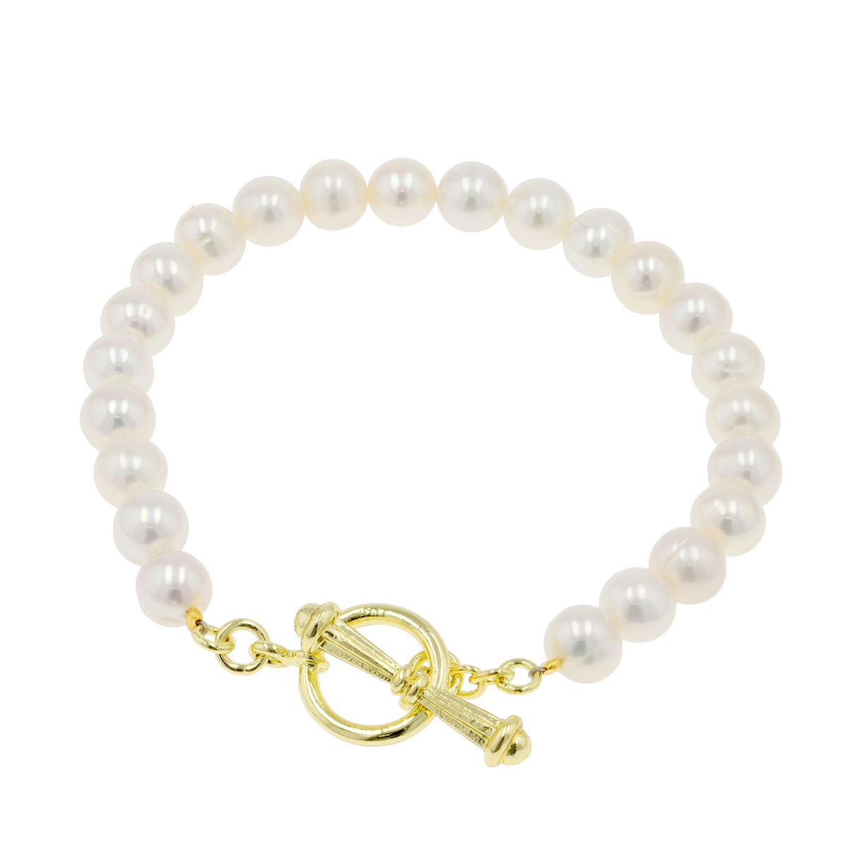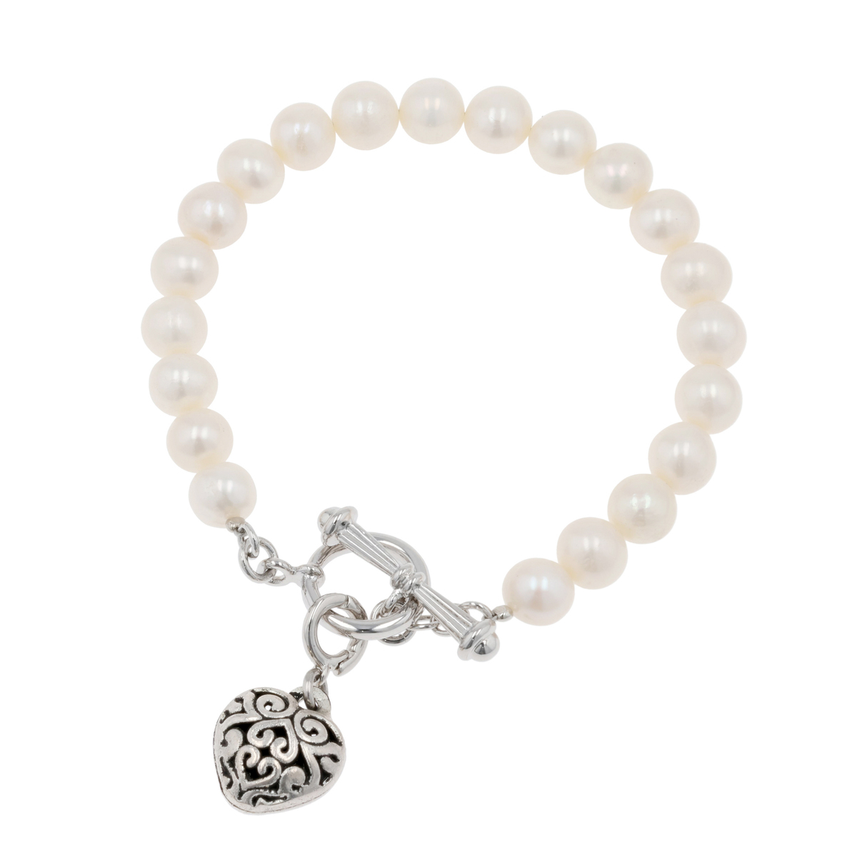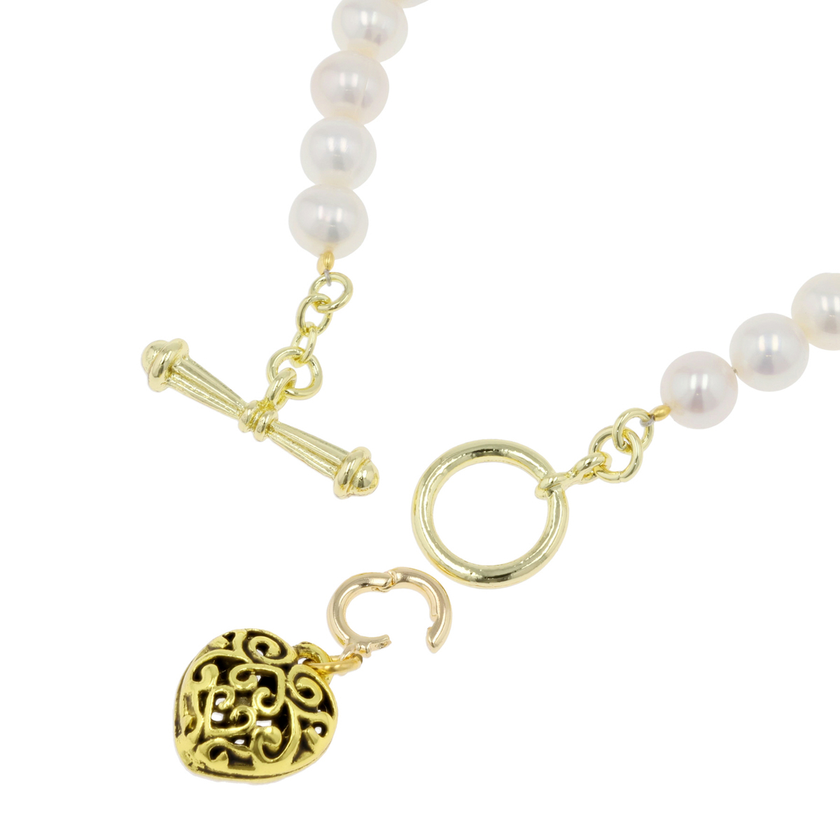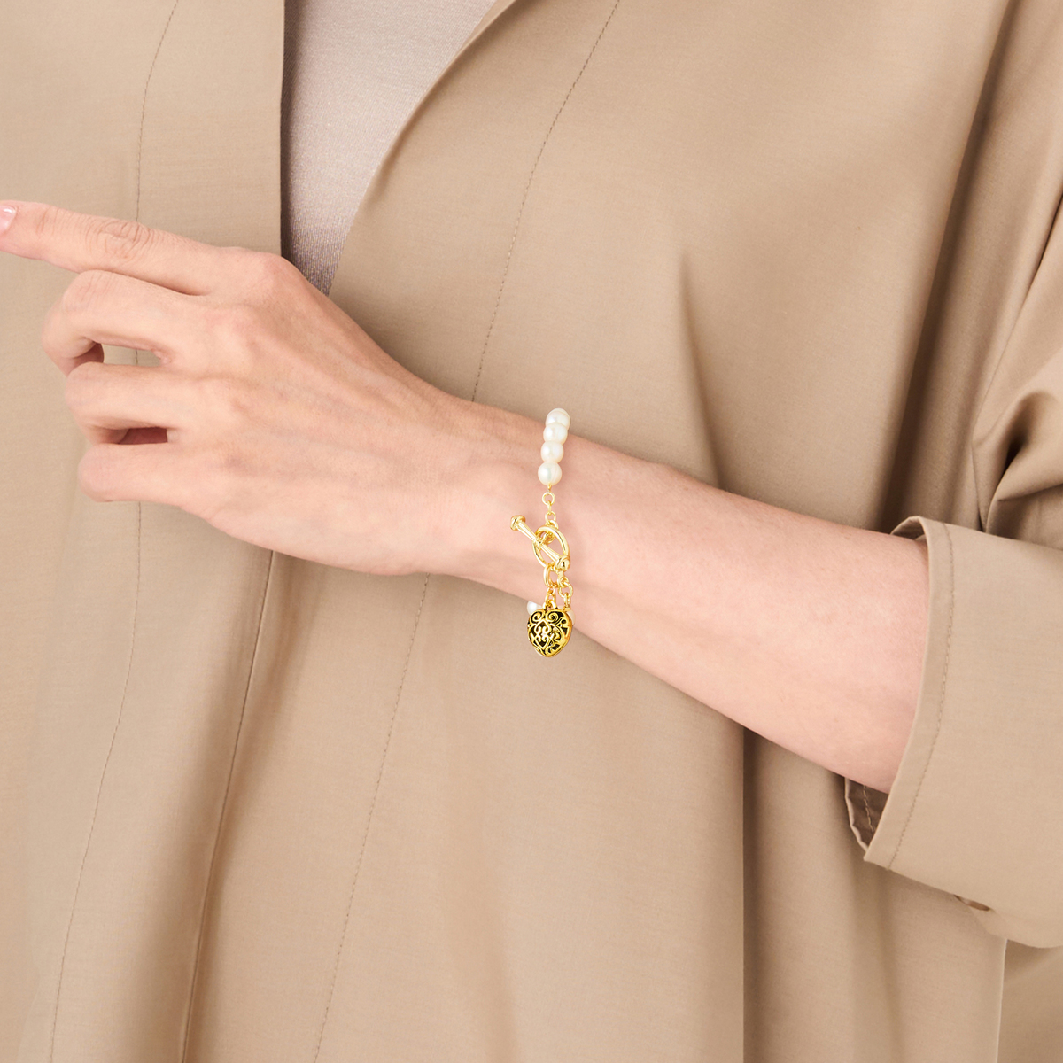 セミバロックの淡水パールと取り外せるハートチャームを組合せたブレスレット。トグルタイプの留め具が大人可愛い印象を引き立てます