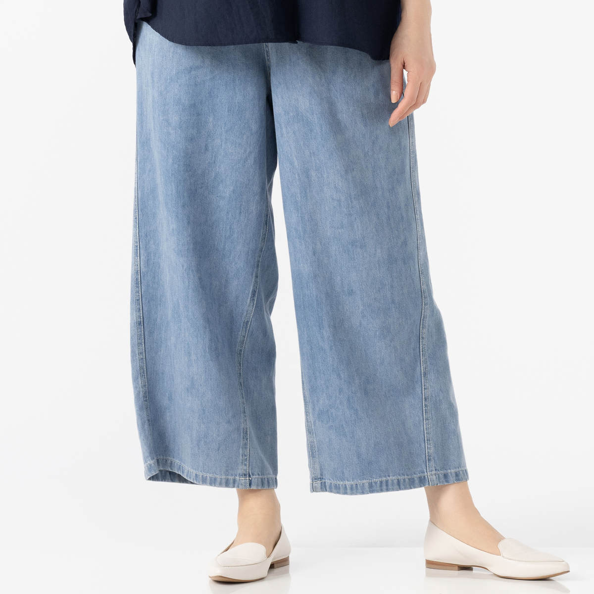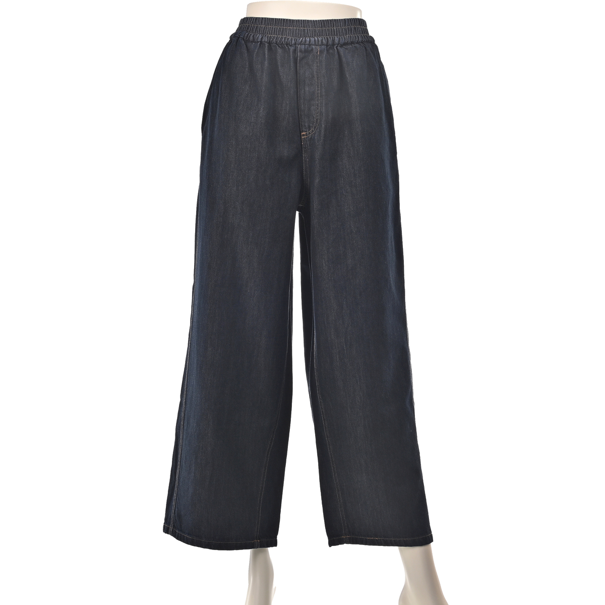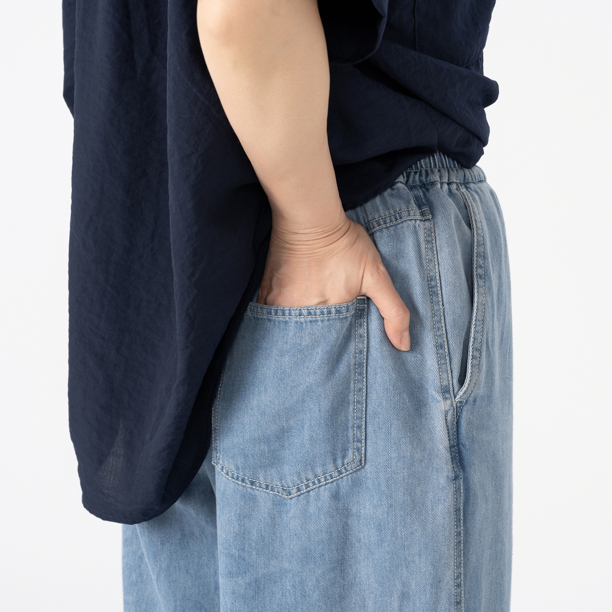 ゆったり穿けるワイドシルエットのデニムパンツ。ウエストは総ギャザーゴムで、引っぱってそのまま穿けるプルオン仕様です。たっぷりした分量を活かしつつ、脇線と股下線を裾に向かって前身頃が細くなるように設計し、カジュアルでもすっきり見えるラインに仕上げています