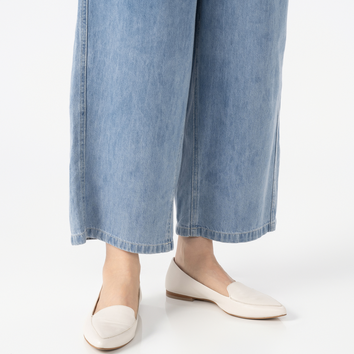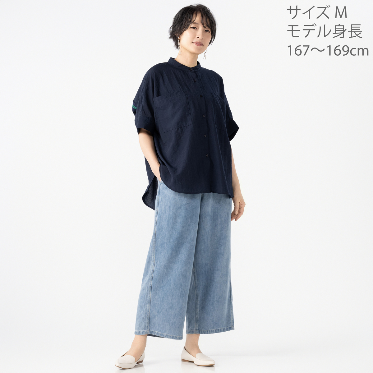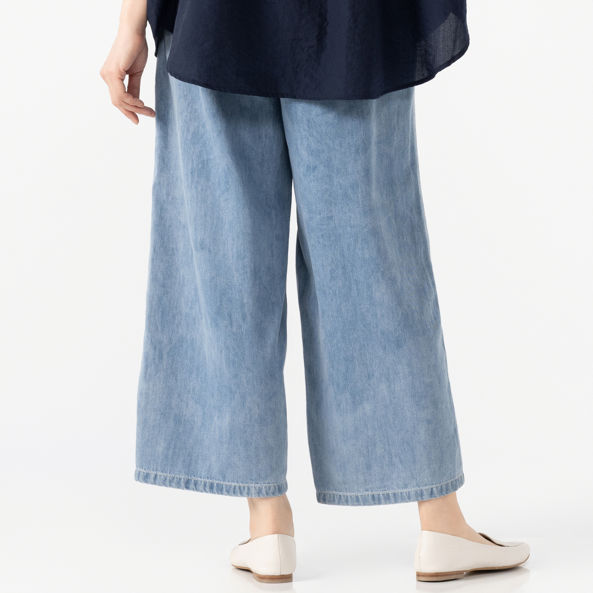 ゆったり穿けるワイドシルエットのデニムパンツ。ウエストは総ギャザーゴムで、引っぱってそのまま穿けるプルオン仕様です。たっぷりした分量を活かしつつ、脇線と股下線を裾に向かって前身頃が細くなるように設計し、カジュアルでもすっきり見えるラインに仕上げています