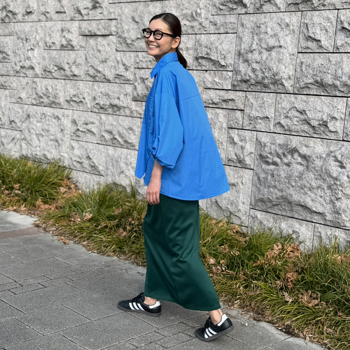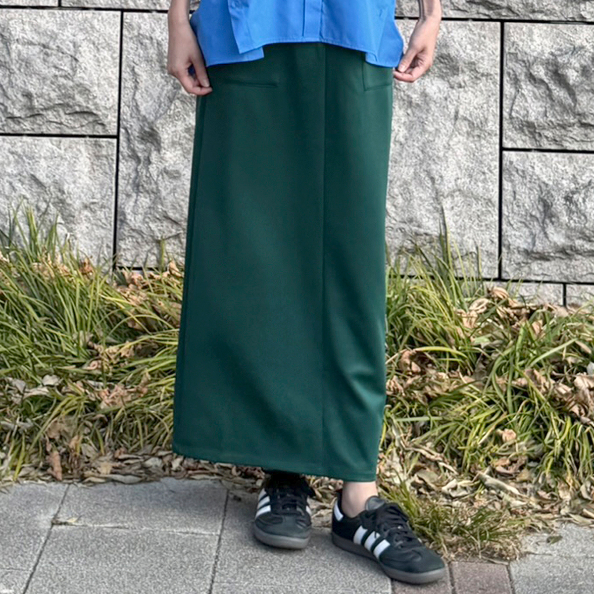 長めの丈設定とタイトめなシルエットで、脚長・細見え効果も期待。裾にはスリット入りで、足さばきもラクです。素材ならではの適度なハリが、シルエットを美しくキープしてくれます